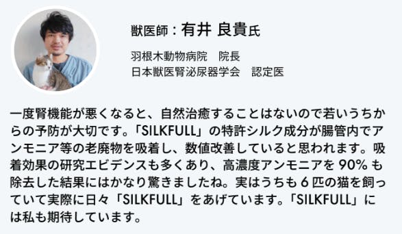 2025/05/26 14:38【ご支援くださった皆さまへ】このたびは、我々の猫ちゃんの腎臓ケアフードのクラウドファンディングにご支援・応援をいただき、心から感謝申し上げます。最終的に目標には届かず、65%という達成率でプロジェクトを終了することとなりました。正直に言って、悔しい気持ちや、力不足を痛感する気持ちでいっぱいです。それでも、温かいコメントをたくさん寄せてくださった皆さま、何度も支援をしてくださった皆さまのおかげで、ここまで来ることができました。本当に、本当にありがとうございます。この度のフードは我々の腎臓をケアできるエビデンスがしっかり出ている独自原料『カラダシルク®』も配合しており、ご飯を食べるだけで腎ケアができる我々の自信作となります。更に、本当に沢山の猫ちゃんに食べて頂きましたが、味を嫌がることなく気にせず食べてくれるスーパーフードとなっております。商品は随時配送させて頂きますので、楽しみにお待ちいただければと思います。今回のフード開発は、生産ロットの大きさという大きなハードルがあり、クラウドファンディングという方法を選ばざるを得ませんでした。ただ、私たちのサプリメントは現在、全国で数百の店舗様に取り扱っていただいており、これからはその大切なパートナーの皆さまと力を合わせて、この度のフードも誠意をもってしっかりと広げさせて頂ければと思っております。今後はアメリカでも研究開発を進め、世界中の猫ちゃんとそのご家族の健康と幸せに貢献できるよう、挑戦を日本だけでなく、世界にも広げていきたいと思っています。今回いただいた励ましの言葉や想いは、これからの原動力になります。今後の私たちの挑戦も、ぜひ見守っていてください。そして、またいつか、どこかで直接お会いできる日を心から楽しみにしています。今後ともどうぞ宜しくおねがいいたします!■公式ECサイトhttps://silkfull.co/■Instagramhttps://www.instagram.com/silkfull_pet/NEXT NEW WORLD 代表取締役 高嶋 耕太郎 もっと見る私たちの腎活の取り組みを日経クロストレンド様に掲載いただきました!