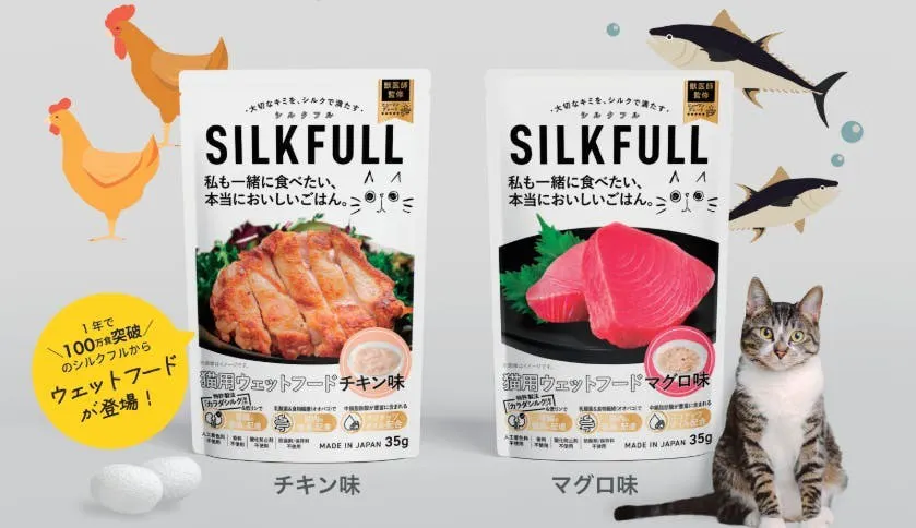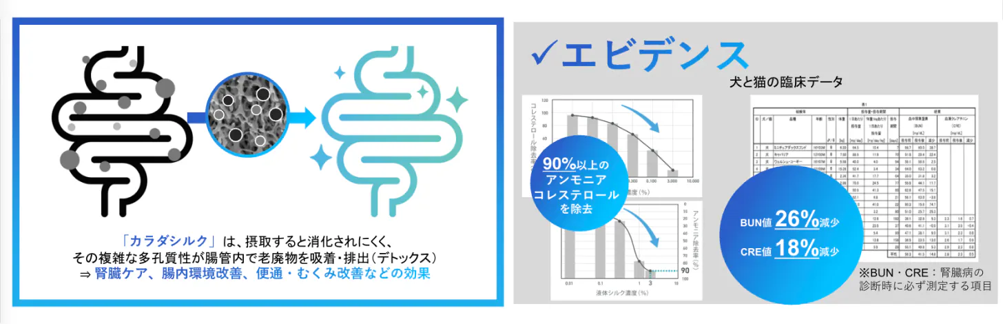 シルクの本場・群馬県桐生市を拠点に、横浜市立大学やシンガポール国立大学など、国内外の研究機関と連携。猫の腎臓をケアできる「カラダシルク®」配合のサプリメント は、発売1年で100万食突破、ヒト用でも、腎活ドリンク「ZINZO」をはじめとする製品展開を進めています。