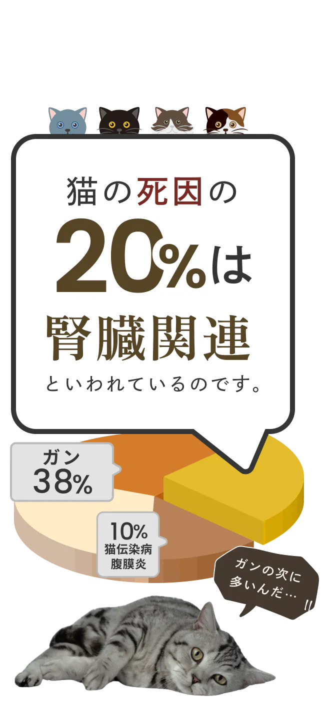 猫の3頭に1頭が、生涯のうちに慢性腎臓病を発症し、死因の約20%を占めています。
