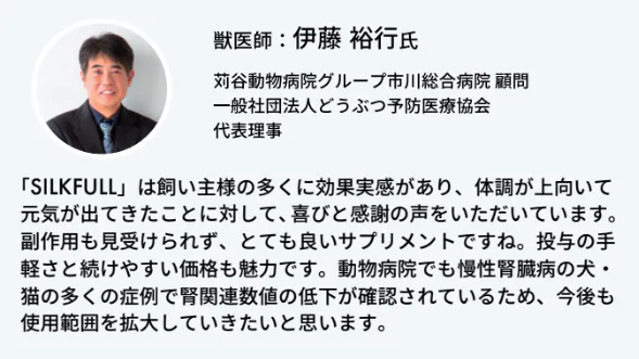 SILKFULL/SILCATは多くの動物病院でも使用されており、現場からも、ポジティブな意見をいただいております。