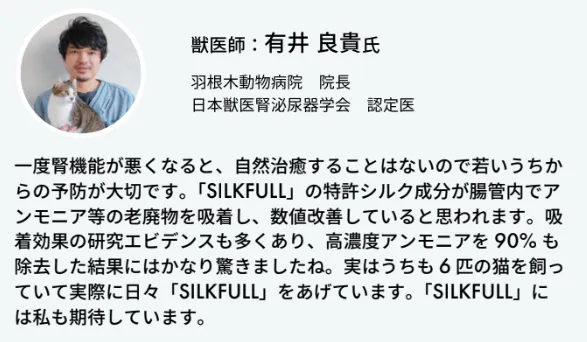 そこで、私たちは、腎臓に負担をかけるアンモニア、腸内環境を乱すコレステロールを90%以上吸着し、腎機能が悪化すると上昇するBUN(血中尿素窒素)の数値も、約26%低下させることが明らかになっているシルクタンパク「カラダシルク®」を配合したサプリ「SILCAT」を開発。