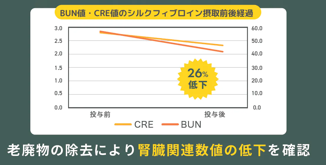 また、腎機能が悪化すると上昇するBUN(血中尿素窒素)の数値も、約26%低下させることがわかっています。