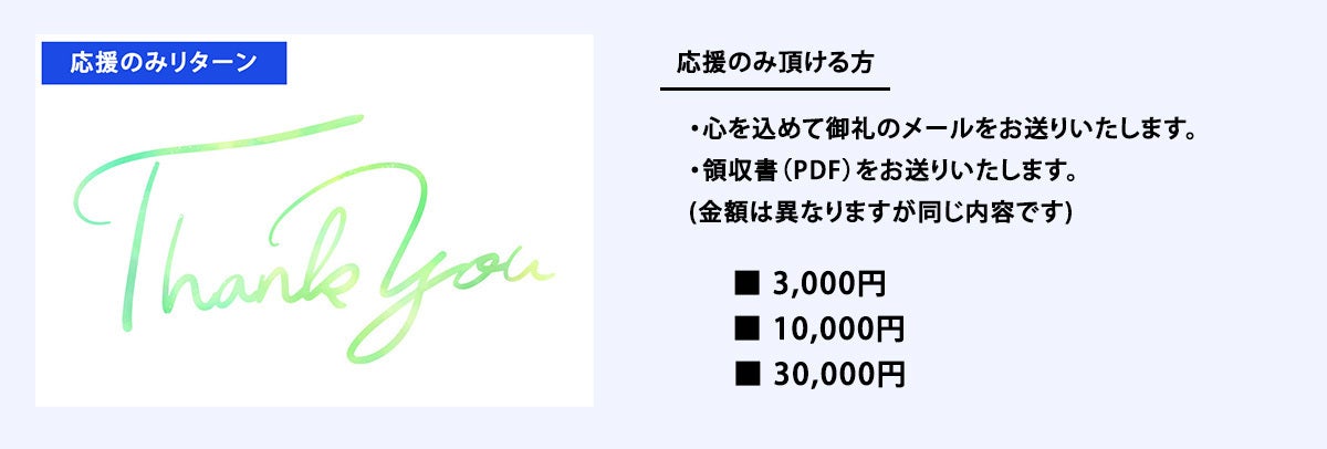 応援いただける方へ、様々なリターンをご用意いたしました。