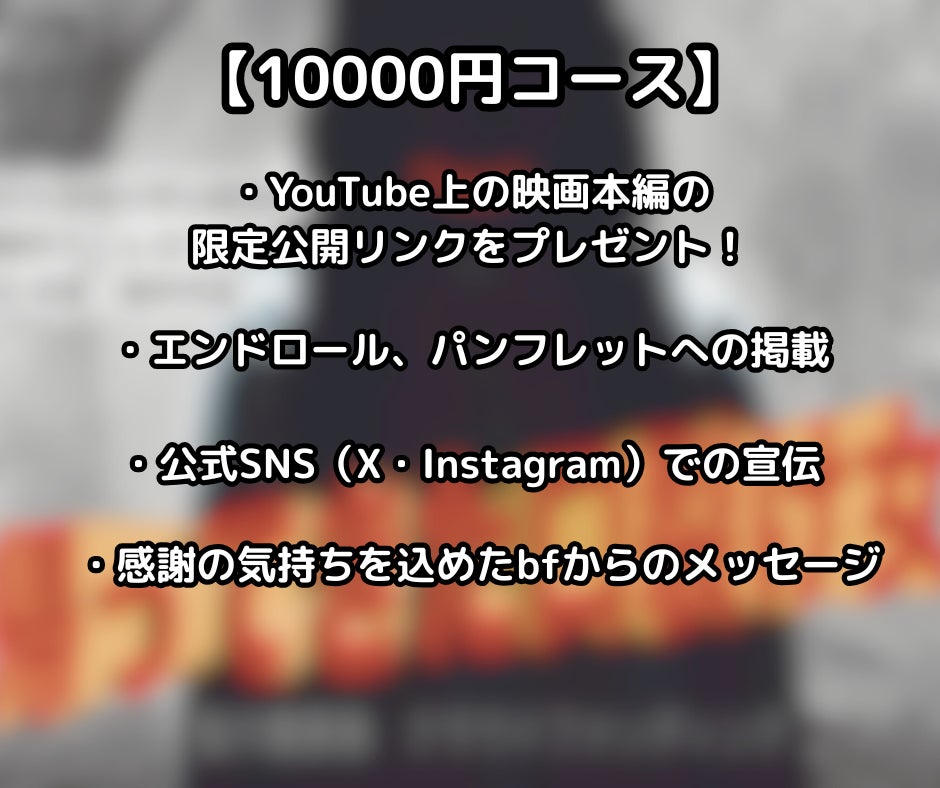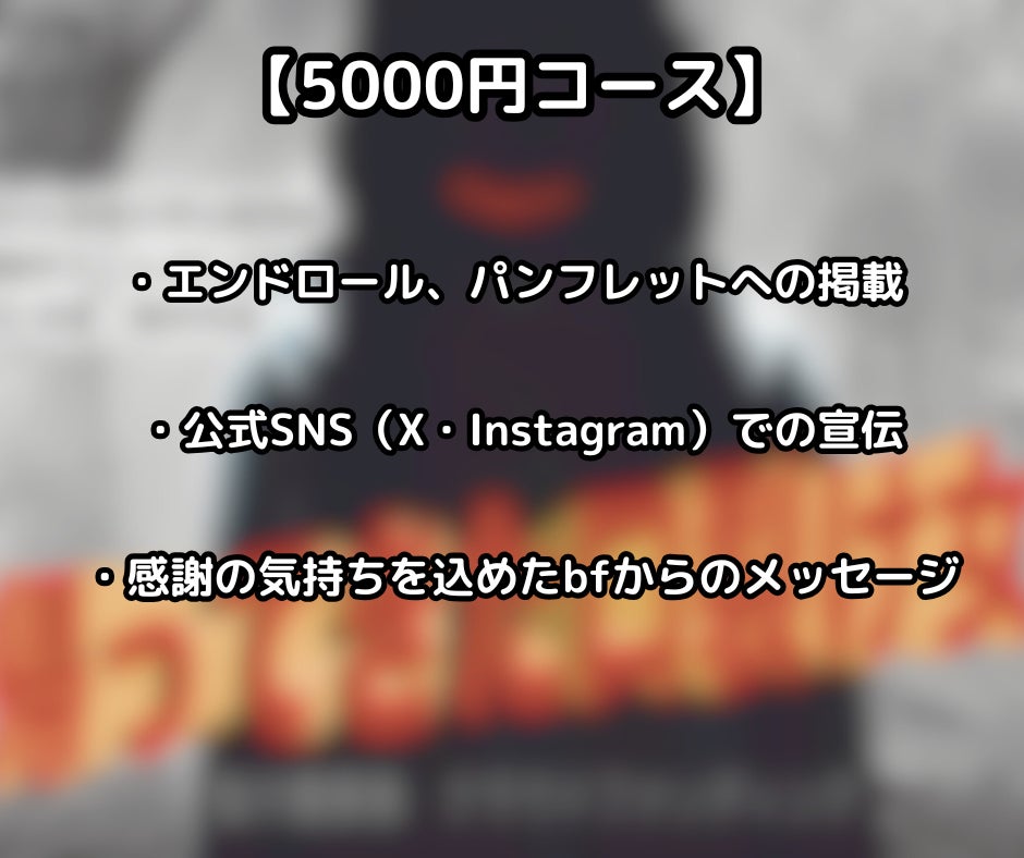 ⚪︎5,000円以上の支援金を頂いた方の中で上映会に直接来ていただいた方にはパンフレットをご提供させていただきます。上映会の詳細につきましては、後日ご登録していただいたメールアドレスに送信させていただきます。