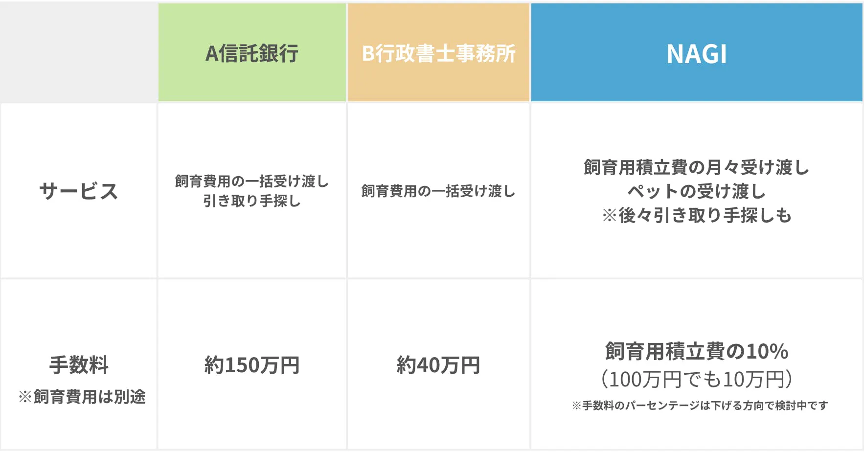 1.飼い主さんは弊社のサービス"NAGI"を通じて、ペットのために月額で積立を行います。