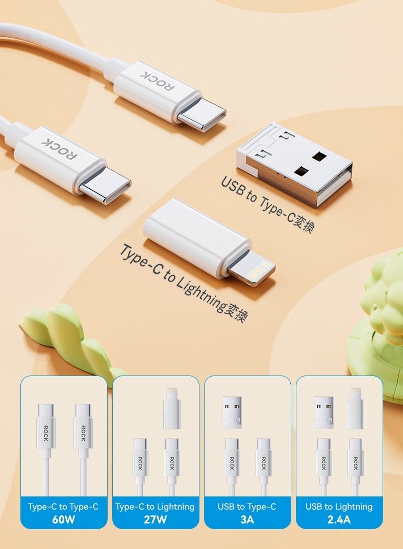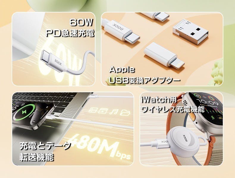 「ROCK」は、4種類の充電方法に対応し、iPhoneやAndroidスマホ、タブレット、Type-C対応デバイス、さらにはノートPCまで、幅広いデバイスを充電できる優れた柔軟性を備えています。あらゆる充電ニーズに対応でき、長く愛用いただける充電ケーブルです。