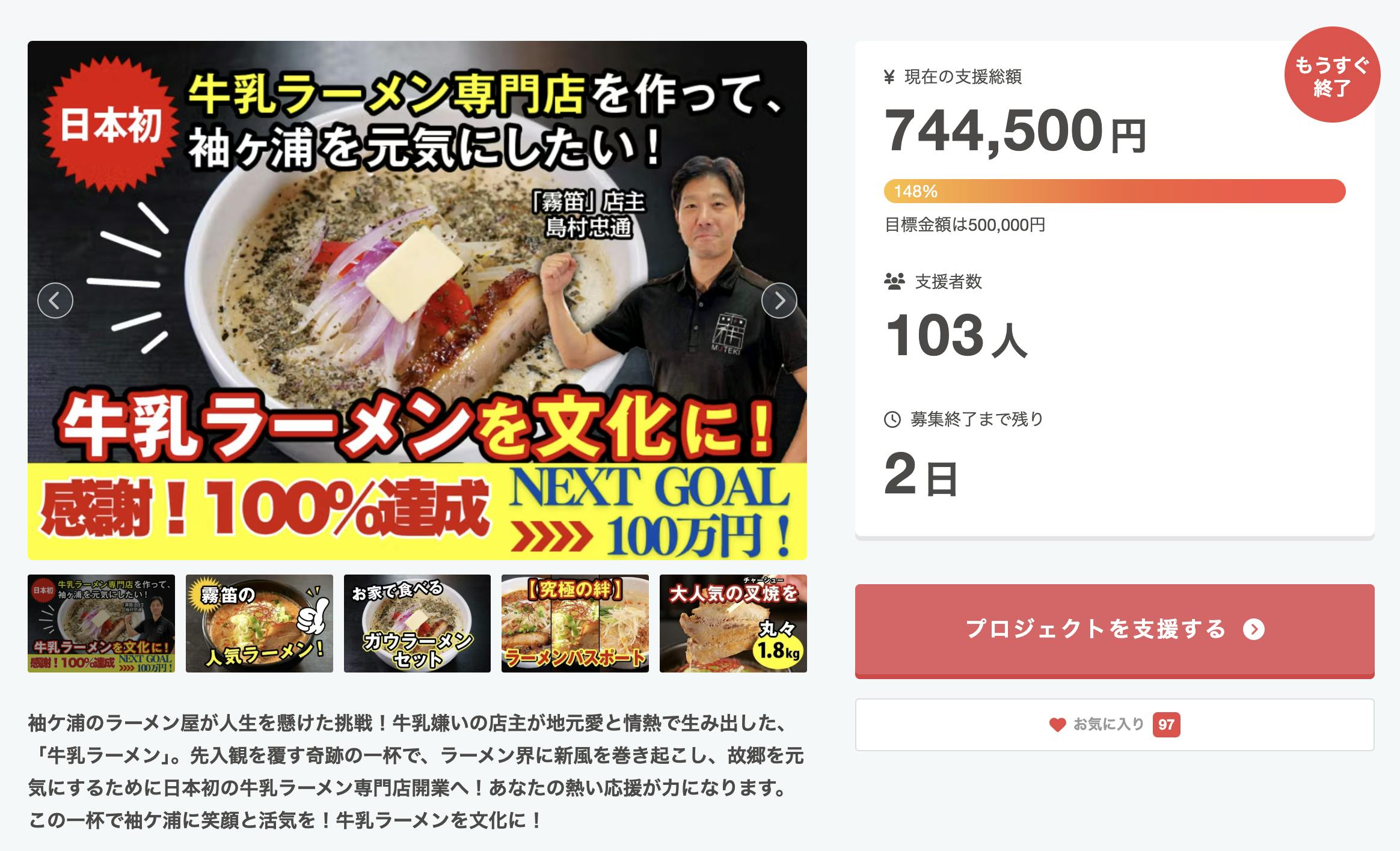 2025/09/29 12:00こんにちは。しまむらです。この度は、僕の初めてのクラファン『日本初 牛乳ラーメン専門店作って袖ケ浦を元気にしたい!』を応援して頂きありがとうございます。クラファンを始めるに当たって、正直最初は怖かったです。初めての経験ですし、本当に上手く行くのか?応援して貰えるのか?と。ただこんな事でビビっていたら何も進まない。ガウラーメンを世に広める事なんて出来やしない。と思い直しやると決めました。そして、ゼロワン出版の鈴木ケンジさんに協力をお願いし二人三脚でやって来ました。ただそれは実務的な話でありここまでこれたのは応援して下さった皆様のおかげです。本当に感謝してもしきれません。この感謝の気持ちを本当の意味でお返し出来るのは、ガウラーメンを世に広め、牛乳ラーメンって美味しいよね!って普通に街中で話して貰える様になる事だと思っております。その為に、今回の応援頂いたお金を用いながら日々努力し続けて行きますので今後とも応援して頂けたら嬉しいです!もし道半ばで諦める様な行動を取っていたら遠慮なくふざんけな!と言って下さい!!!これからもガウラーメンの応援宜しくお願い致します。麺処霧笛 島村 忠通 もっと見る