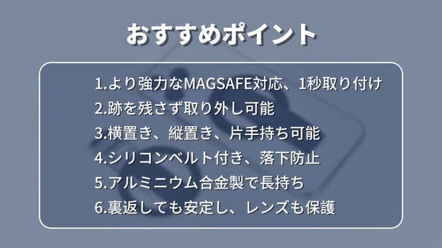 「N52」磁石を採用し、磁力が強くなり吸着力もしっかりとなります。マグネット式スマホリングで、iPhone MagSafe シリーズ本体やMagSafe搭載ケースに1秒で装着できます。
