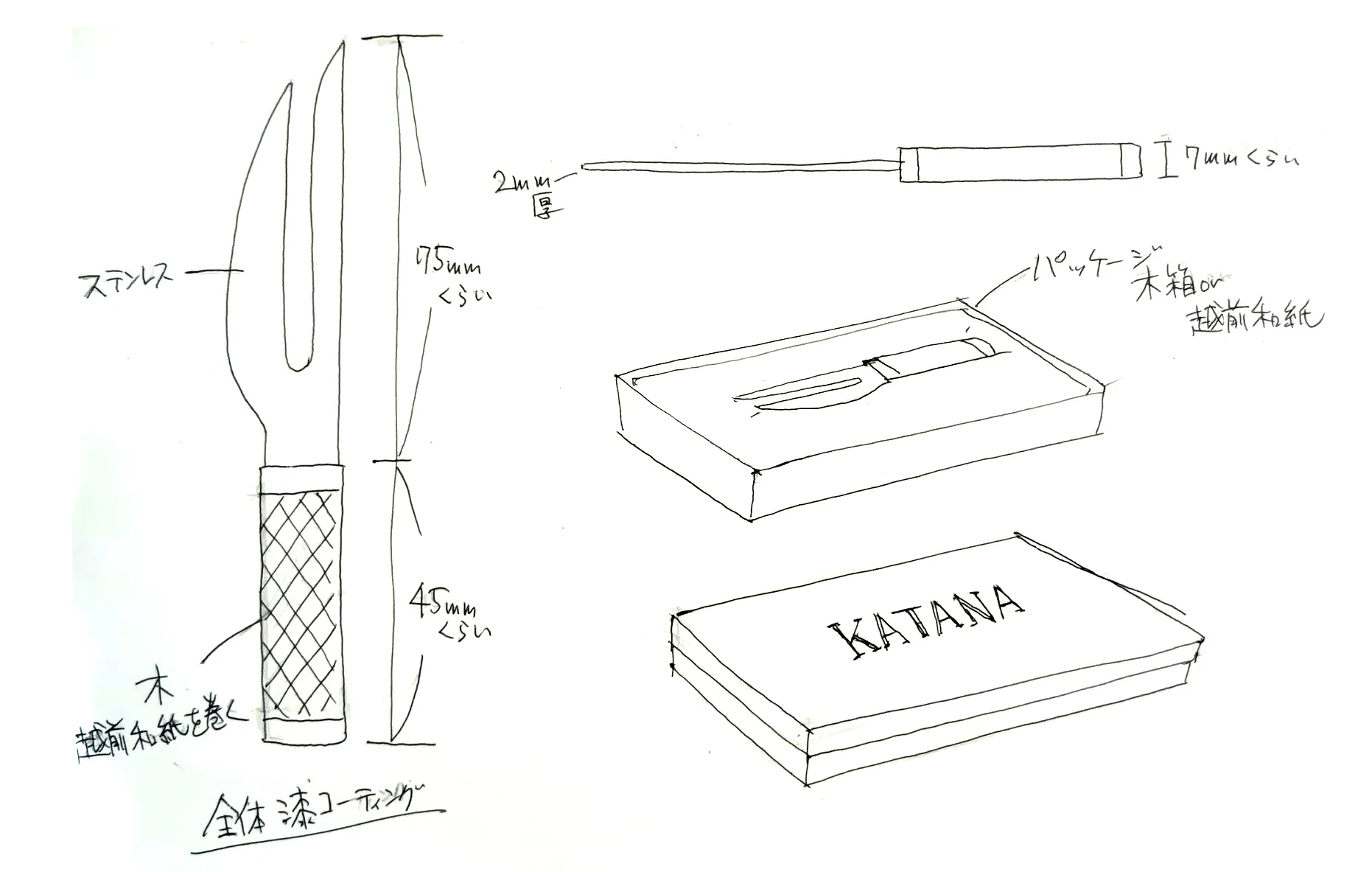 越前和紙の加工技術や、フォーク部分の金型加工、漆塗りなど、福井県内の協力企業と連携済みです。
