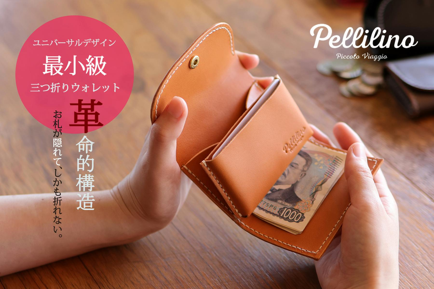 不思議な構造!お札が隠れて折れない!手縫いで丈夫なタンニンなめしのミニ財布