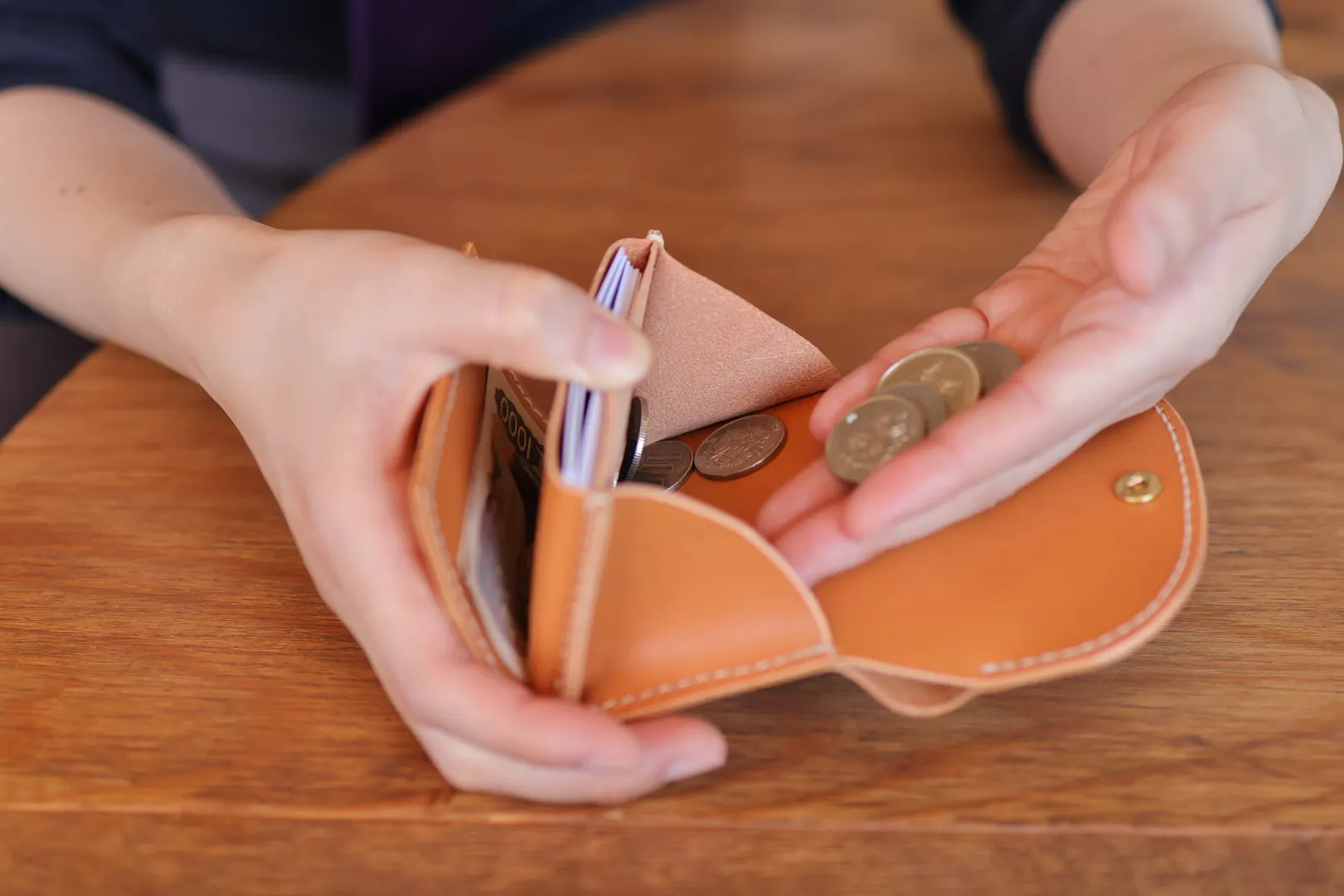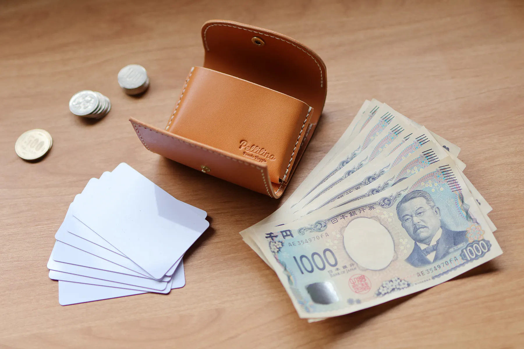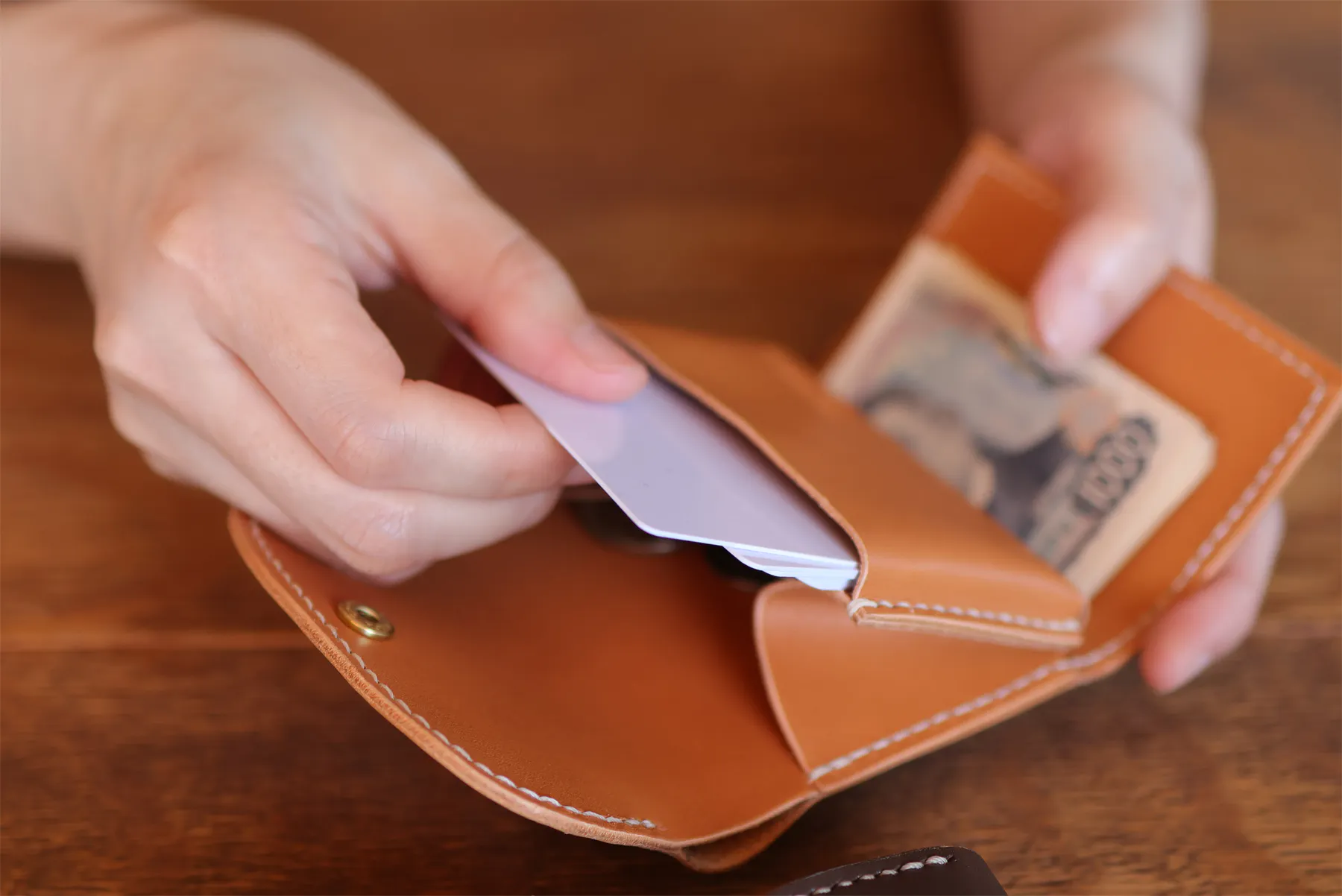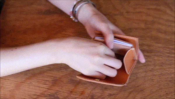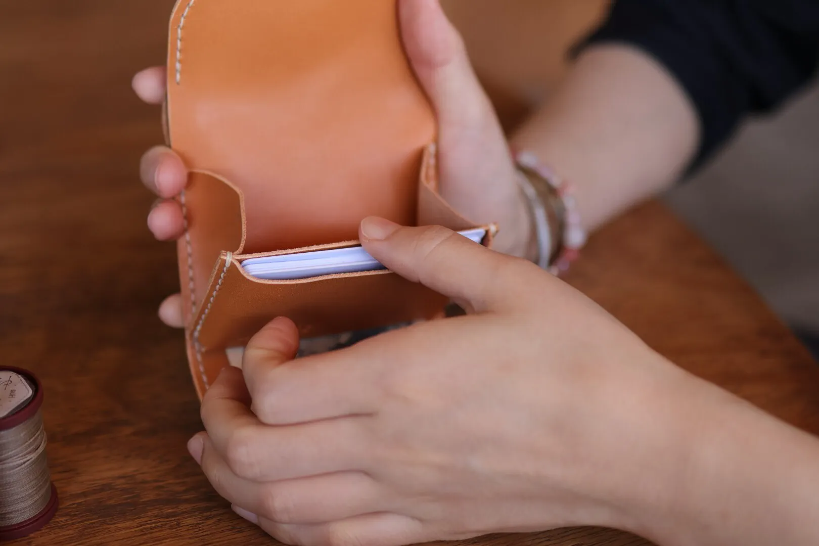 不思議な構造!お札が隠れて折れない!手縫いで丈夫なタンニンなめしのミニ財布