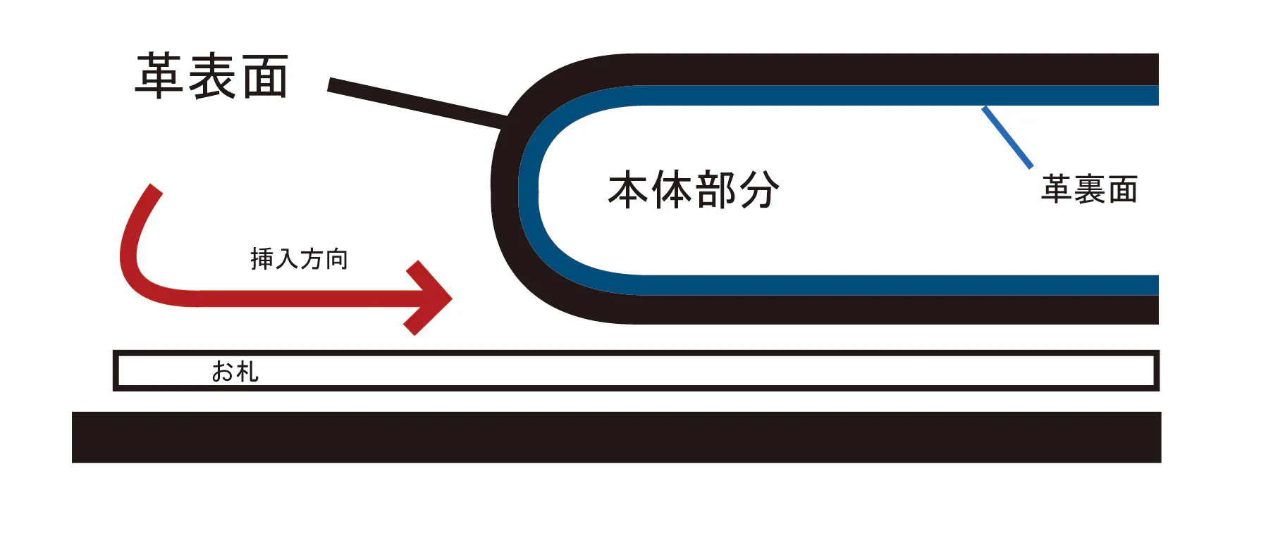 革の銀面(スベスベした表面部分)をお札の挿入口と土台に使っているので、抵抗なく楽に滑るように出し入れすることが出来ます。(下図参照)
