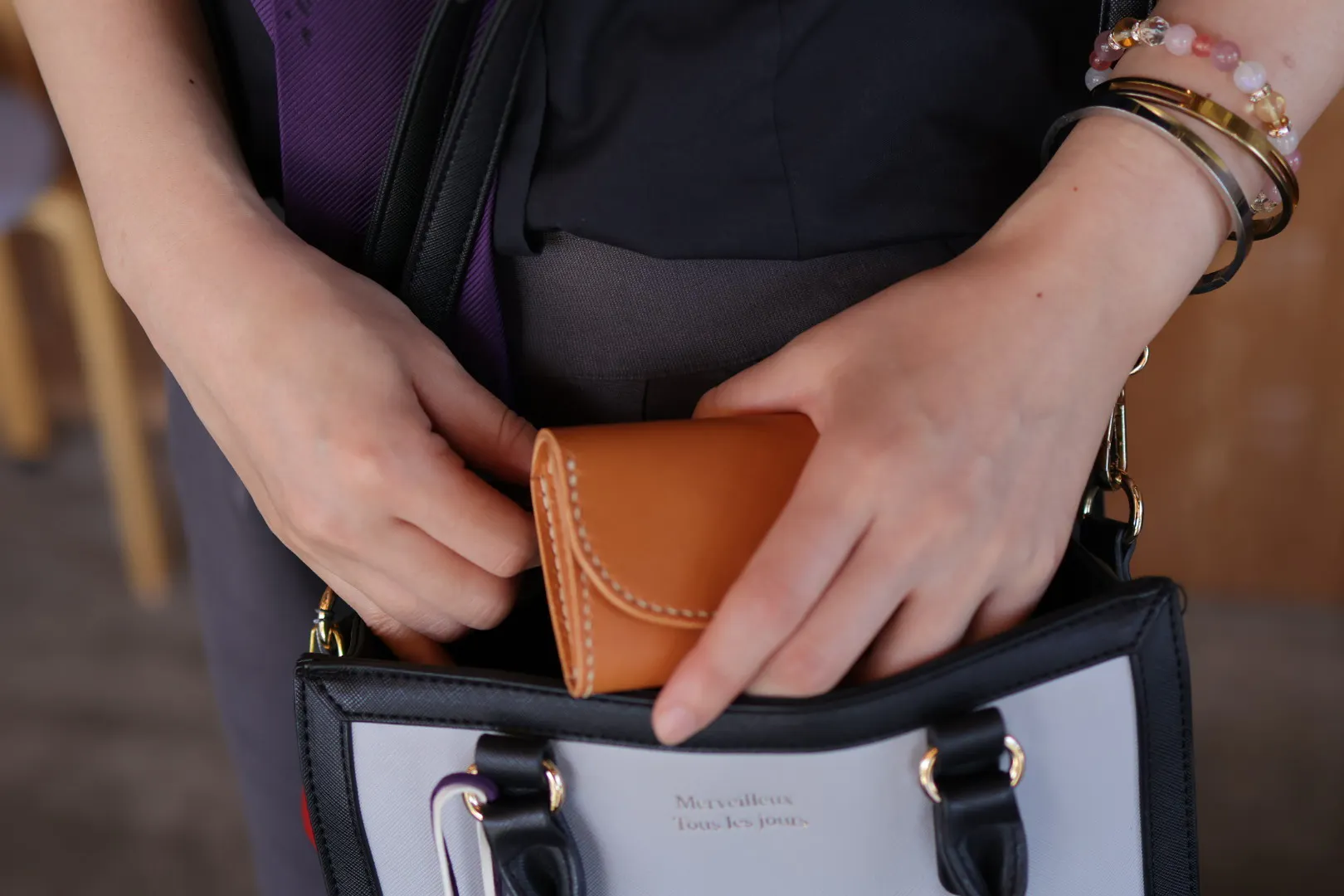 お札の3分の2はしっかりと革の内側に差し込める形にして手元にお札が見え、カードとコインを見やすい位置に配置しすぐに内容を把握できるよう設計しました。