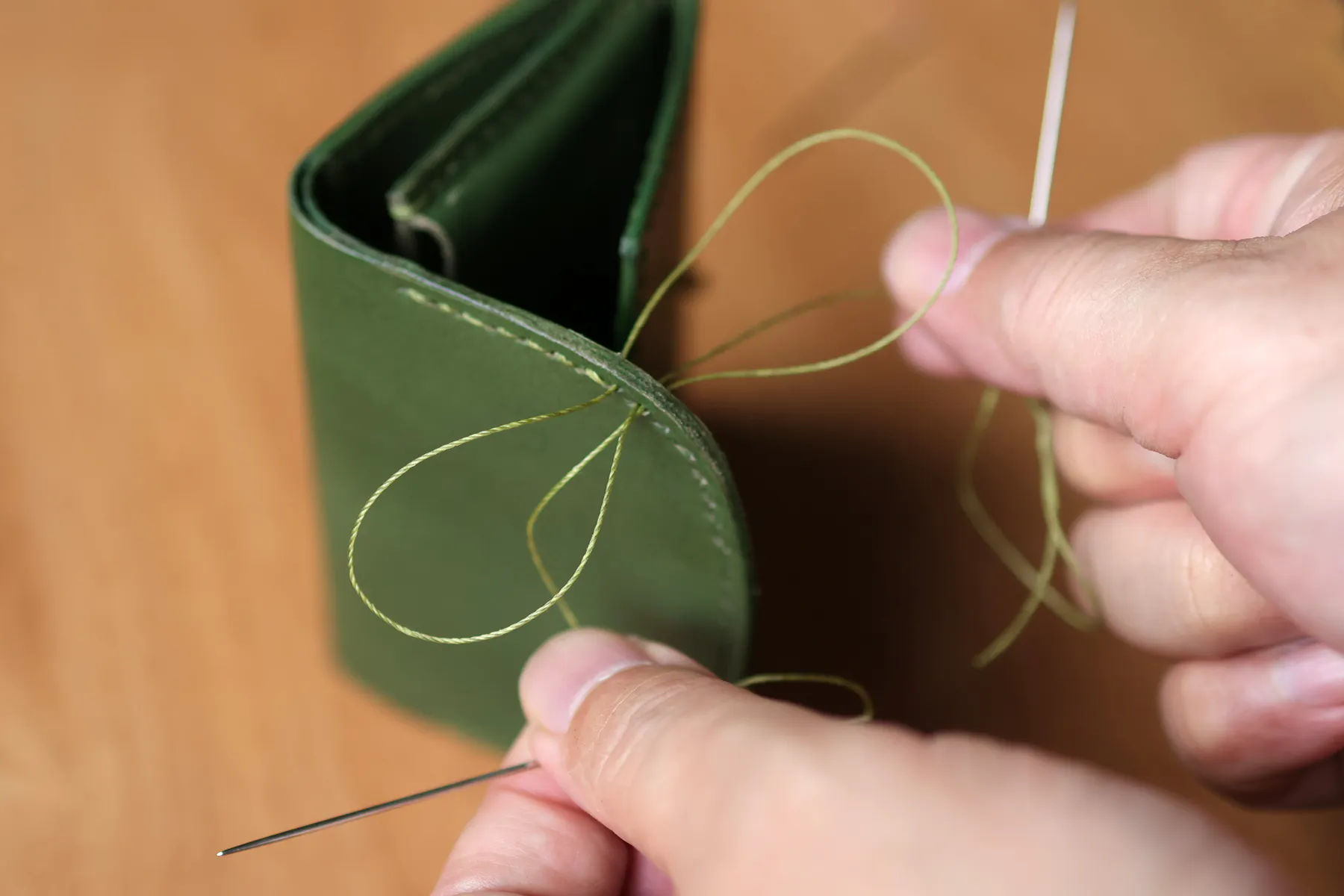 革の繊維質や硬さはどれも個性が違います。それを手で感じながら絶妙な加減でその革に合う力感で糸を引いていきます。タンニン鞣し革の個性を活かすためには手縫いが最適と考えています。