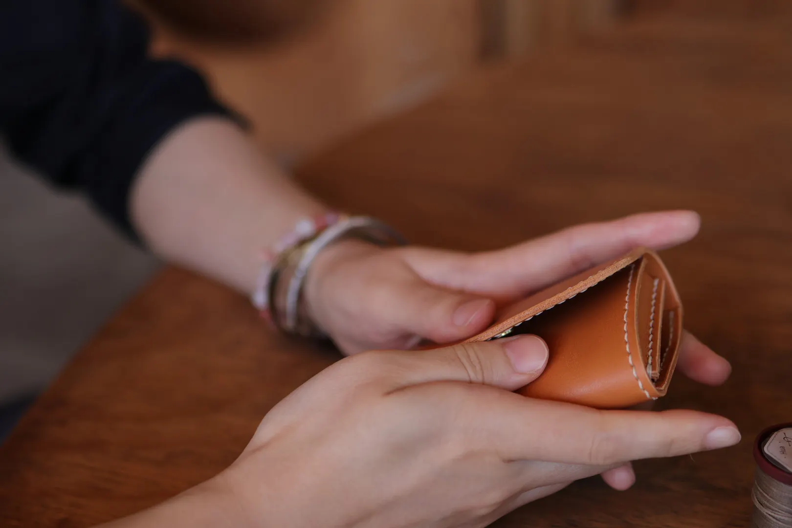 環境に優しい植物タンニンなめし革を職人が裁断から縫製まで一貫して制作し、一針一針丁寧に手縫いで仕立てた丈夫で長持ちする《お札の折れないミニ財布》を特別価格にて販売いたします。