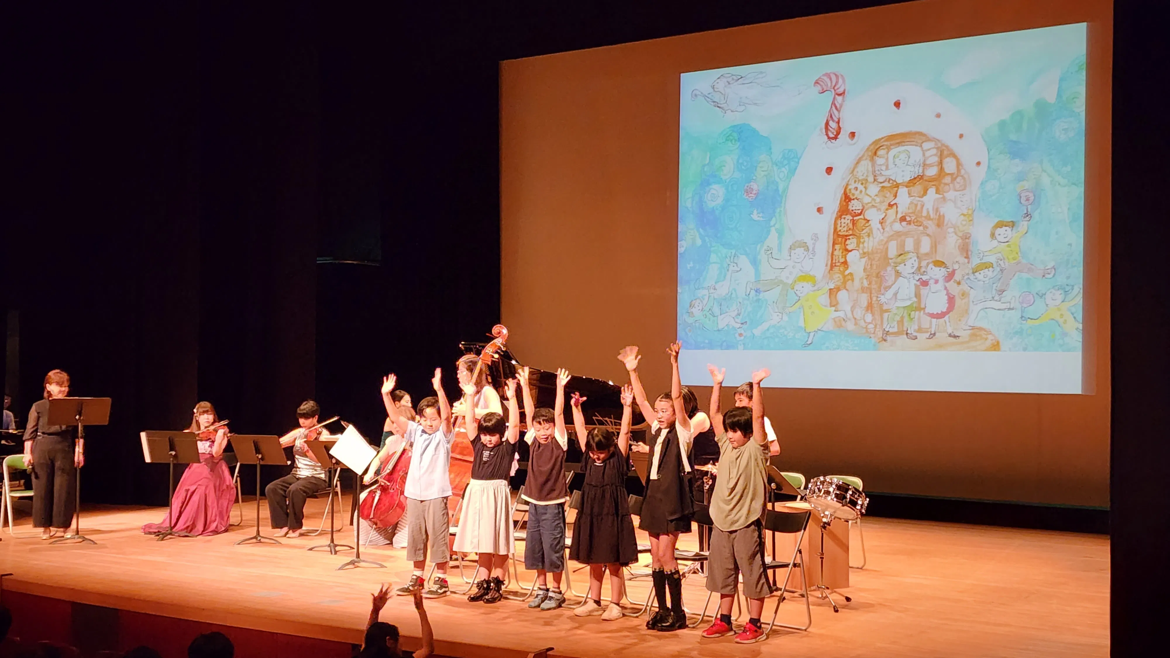 コンサートの最後は、子どもたちもステージで一緒に「さんぽ」を歌い、クラリネットや弦楽器、ピアノの生音の響きをより近くで味わいます。