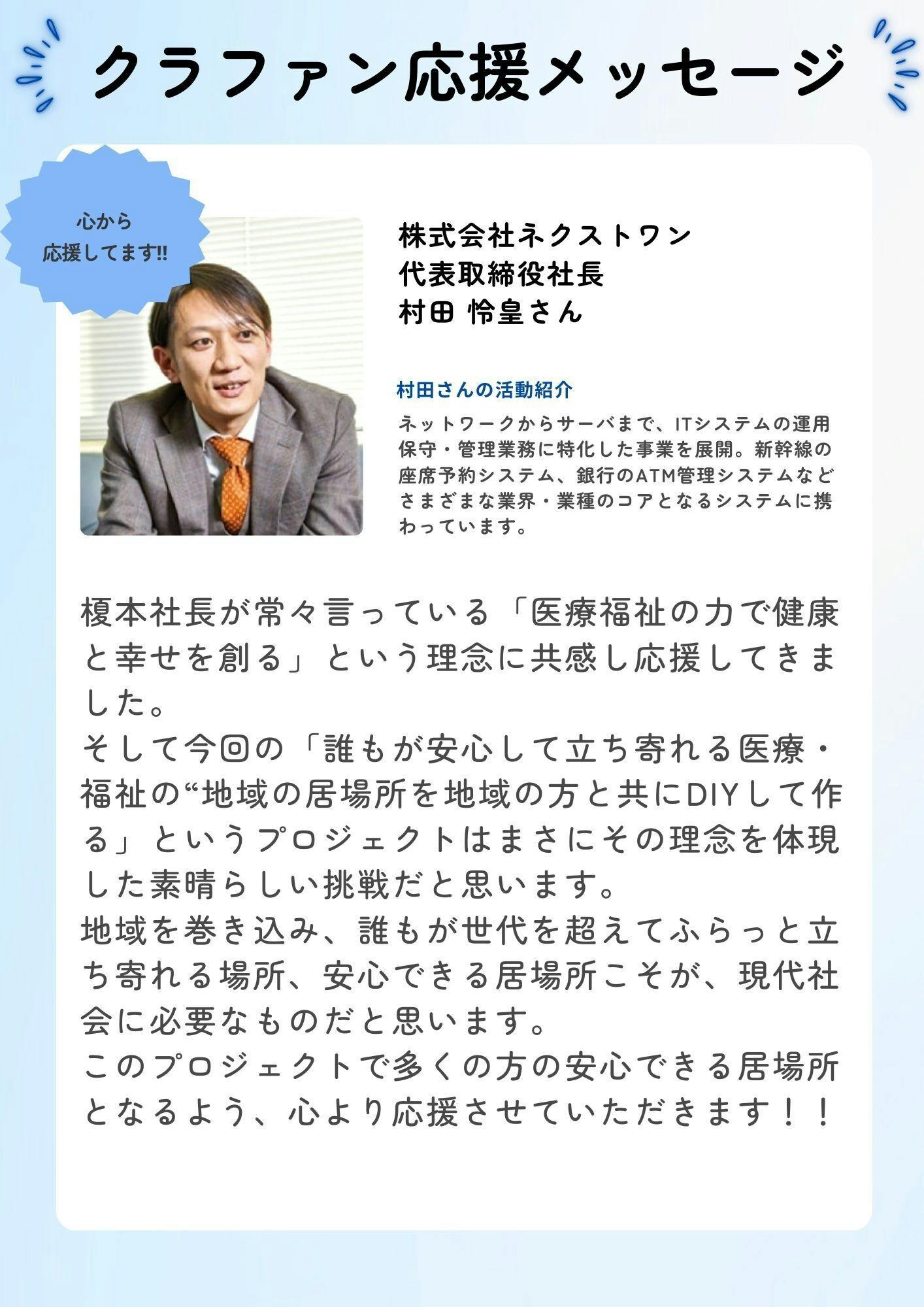 村田さん‼︎応援メッセージありがとうございます✨Uchi careの理念や想いを誰よりも伝えてきたからこそこのプロジェクトが持つ意味を理解くださっている村田さんには感謝しかありません🥲必ずこの地域コミュニティプロジェクトを達成させ、いきいきした地域作りを行なっていきます🔥