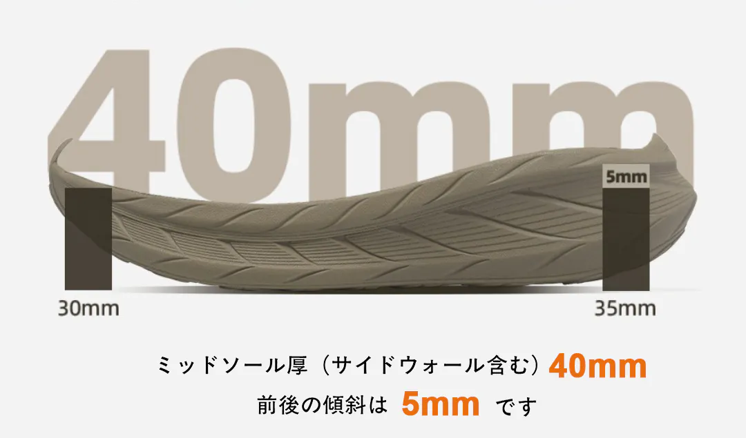 厚底設計により、視覚的にはしっかりとした安定感を感じられる一方で、足への負担が軽減され、長時間の使用でも疲れにくいという特長があります。
