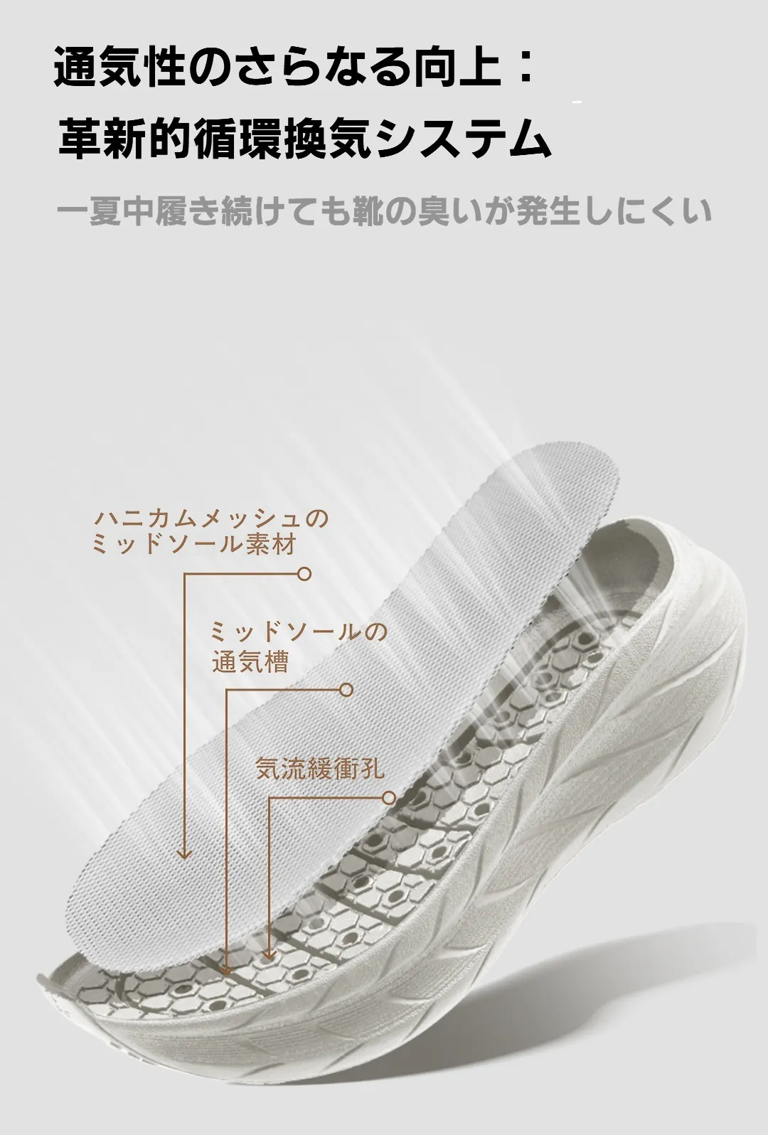 独自のエアサーキュレーションシステムが、足元を全方向から通気性よく保ちます。ムレを防ぎ、ニオイを抑えることで、終日爽やかな履き心地を実現します。