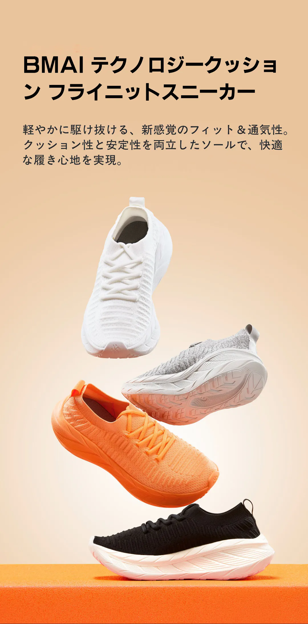 フライニットスニーカー「BMAI」は、雲の上を歩くような軽やかさと、足全体をやさしく包み込むような快適さを兼ね備えた一足です。通勤や通学、ウォーキングやランニングなど、日常のさまざまなシーンで足元をしっかりと支え、快適な歩行をサポートします。