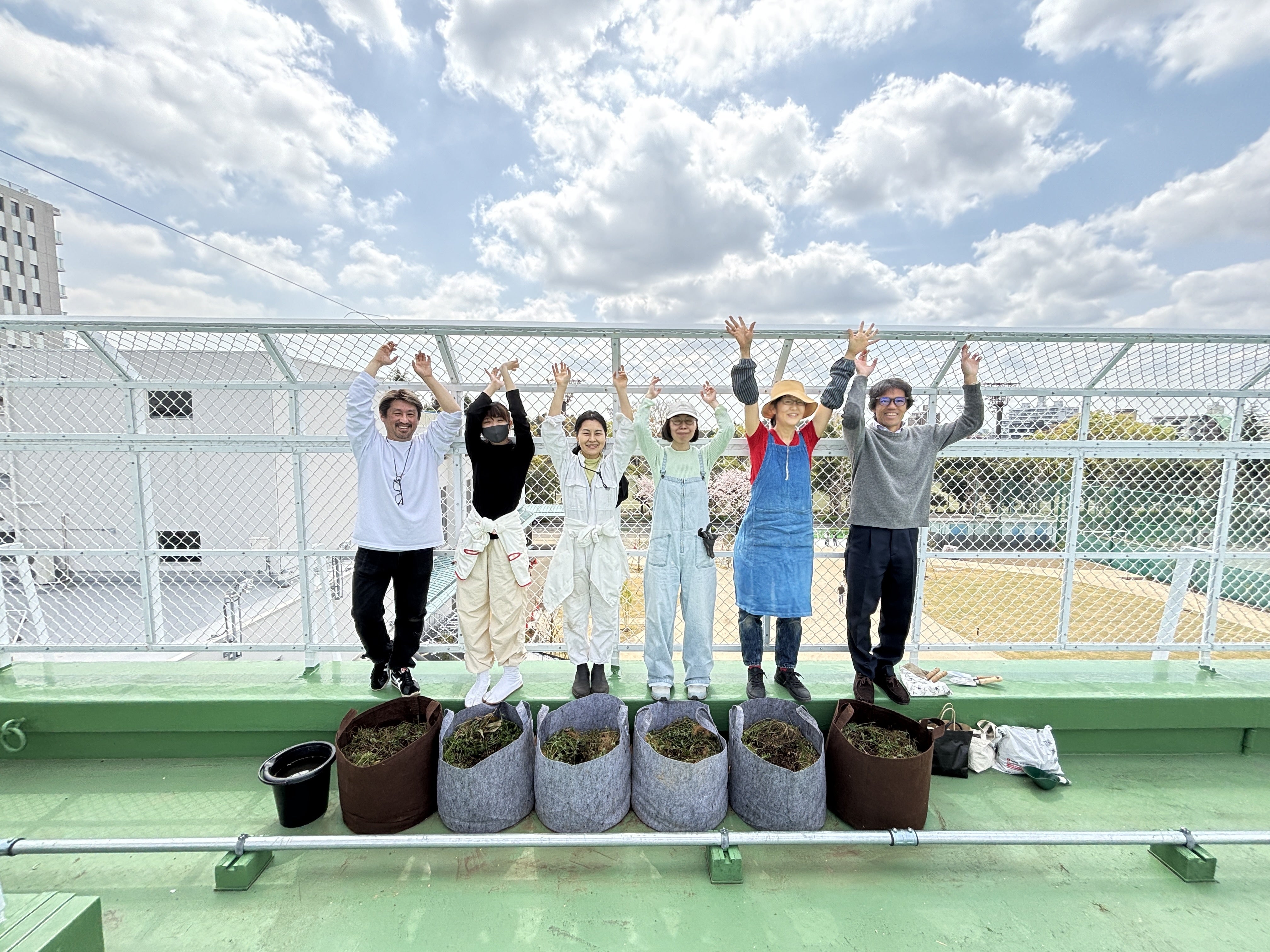 屋上農園のArt Farmさん、養蜂家のBeeslowさんと一緒に屋上でホップを植えた時の写真
