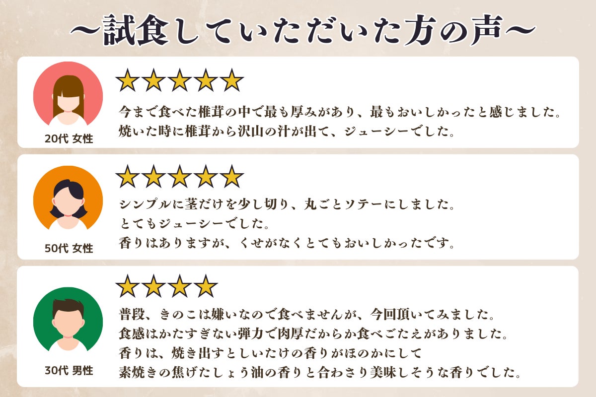 まずはその傘の大きさとふっくらしたフォルムに驚く方が多いです。手に持った瞬間のずっしり感、調理して初めてわかるぷるんととろける食感とジュワッとあふれ出す黄金のしずく──これは、しいたけ好きの方にもきっと新しい感動をお届けできると自信を持っています。