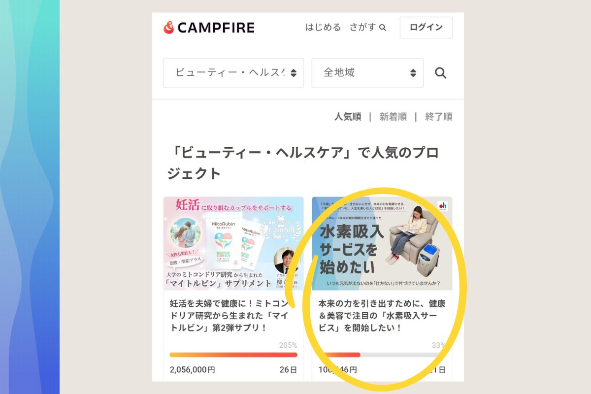なんと既に12名の方にご支援いただき、初日で目標金額の32%を達成することができました!その結果、「「ビューティー・ヘルスケア」で人気のプロジェクト」入りしました!!なんと2番目に掲載されています!!初日からご支援いただいた皆様、ありがとうございました!また、たくさんの応援メッセージもいただき、嬉しく思っています。本当にありがとうございます。皆さんのご支援が、「水素吸入サービスの開始」のための第一歩となります。それにより、弊社の多目的スペース【Vi-Che.HUB】の「ウェルネスラウンジ」としての機能を強化し、集う方々の健康を支え本来の能力を引き出し、「幸せでゴキゲンに人生を楽しむ人と社会」を着実に実現していきたいです。引き続き、ご支援のほど、よろしくお願いいたします。__________▶︎ クラファンページ:https://camp-fire.jp/projects/848775▶︎ 期間:1/3(土)〜1/25(日)23:59__________Vi-Che 代表取締役社長酒井美智子