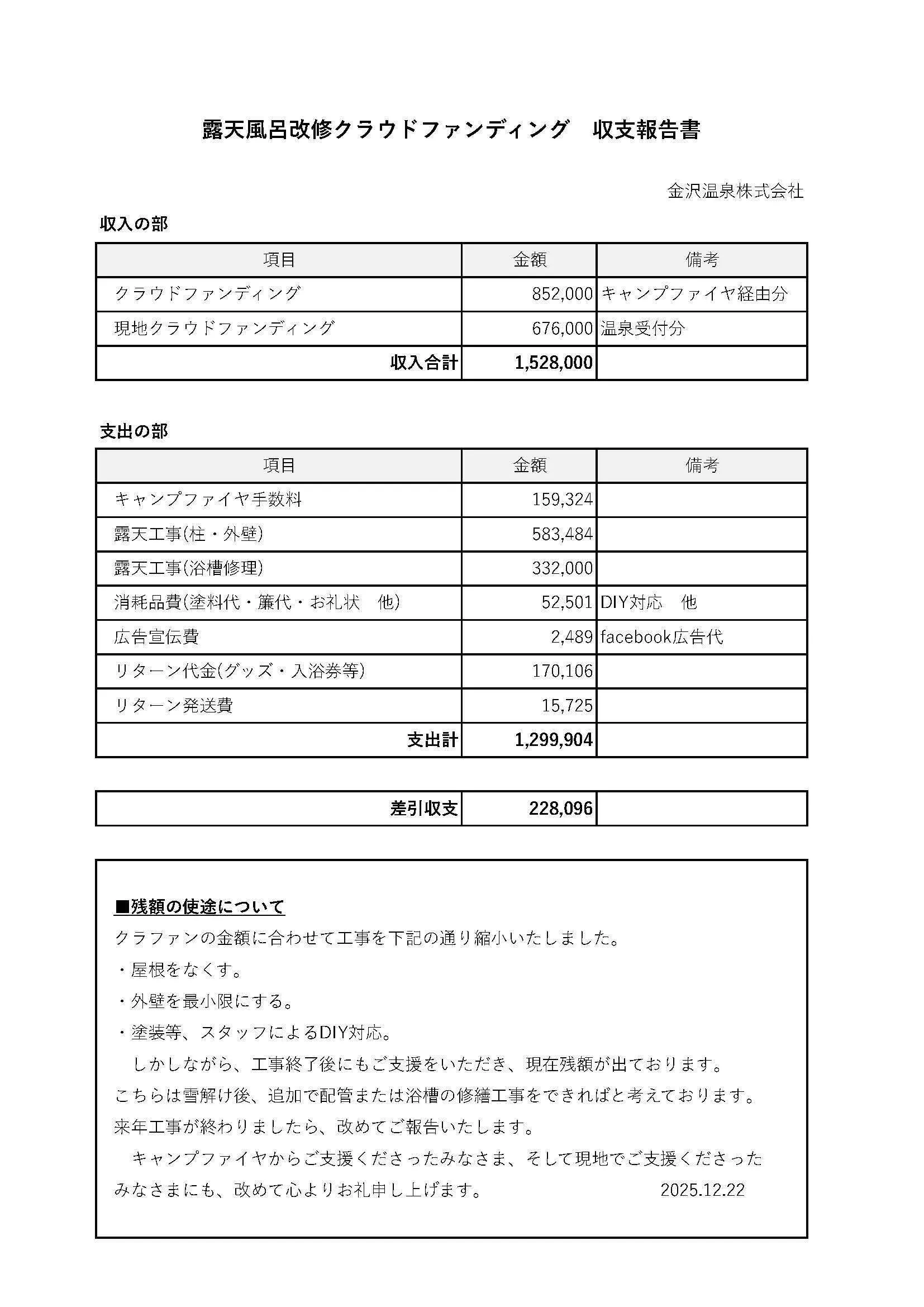 2025/12/22 11:47金沢温泉 露天風呂復活プロジェクトへの応援をありがとうございました。クラウドファンドの収支ご報告させていただきます。大変遅くなってしまいましたが、金沢温泉 露天風呂復活プロジェクトにご支援くださいました皆様へ、収支のご報告と併せて、心より御礼申し上げます。皆様からのご支援のおかげで、なんとか露天風呂の復活工事を進めることが出来ました。工事にあたっては、ご支援いただいた金額内で、既存設備の活用や工程の見直しなど工夫を重ねて進めてまいりましたが、近年の資材価格の高騰、想定以上に老朽化が進んでいた箇所の補修などもあり、露天復活最低限の部分のみの工事となりました。が!工事終了後にもご支援をいただき、現在残額が出ております。こちらは雪解け後、追加で配管または浴槽の修繕工事をできればと考えております。地域の小さな温泉施設でありながら、「露天風呂をもう一度復活させたい」という想いに共感し、ご支援くださったすべての皆様に、心より感謝申し上げます。改めて‥‥目指すのは「地域の人と旅人が交差する、もうひとつの居場所」です。今年構想していた温泉でのイベントは、来年開催できるよう準備を進めて参ります。ゆっくりではありますが、この場所を通じてたくさんの繋がりが生まれる場所となるようこれからも精進しこれまで以上に皆様に愛される金沢温泉となるよう努めてまいります。 また、イベントや情報発信などを通じて、この露天風呂と金沢温泉の魅力を皆様と共有していければと考えております。引き続き、金沢温泉を温かく見守り、お力添えをいただけましたら幸いです。本当にありがとうございました。 もっと見る