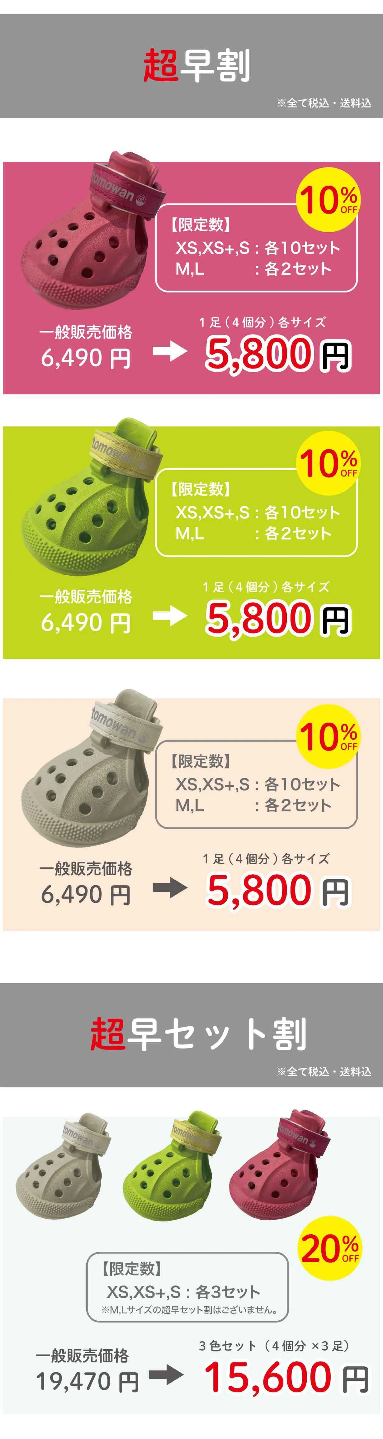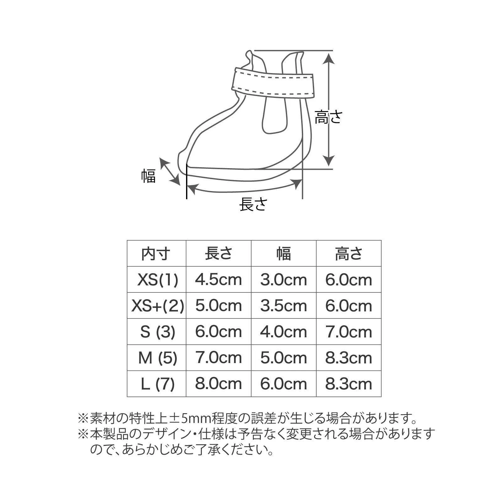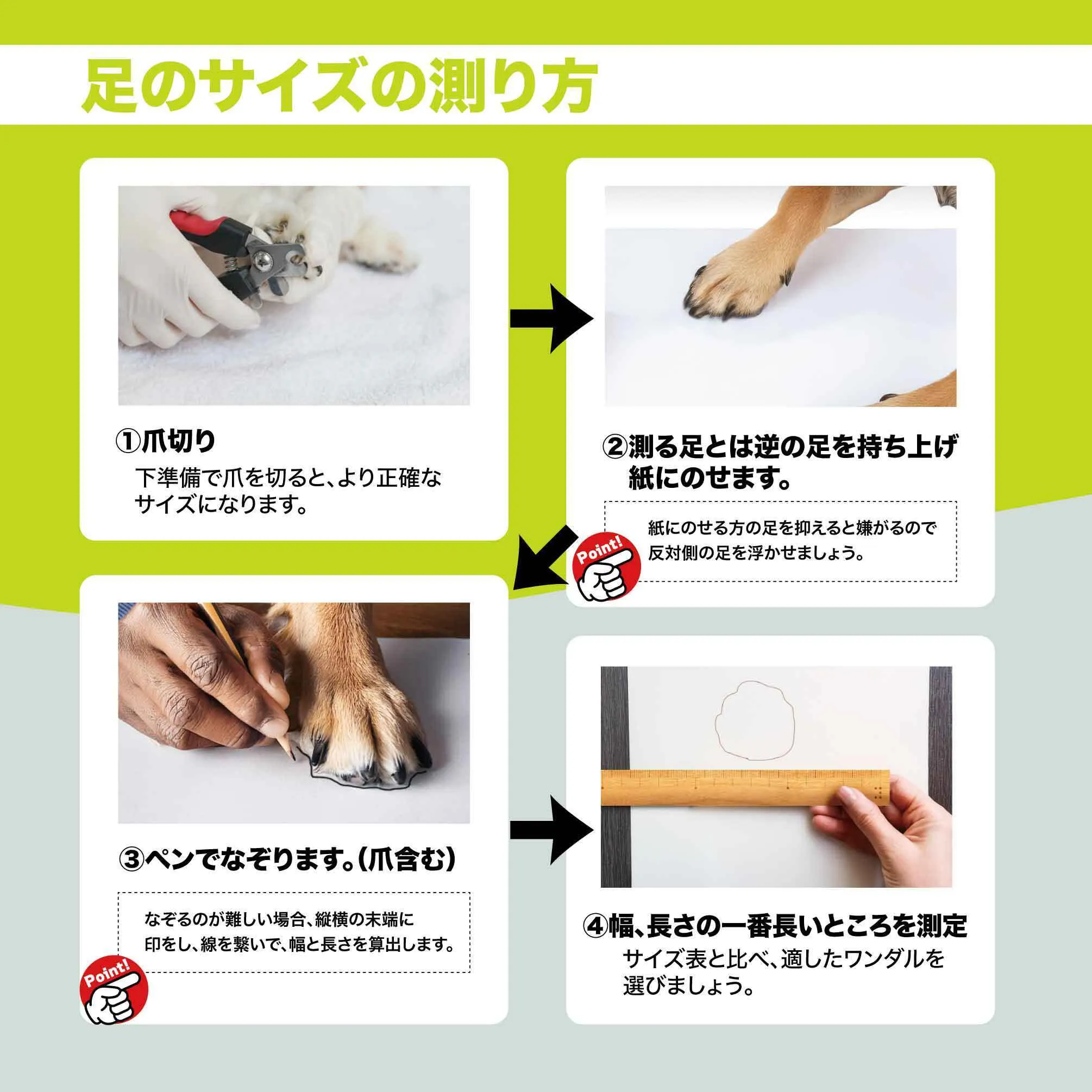※わんちゃんは後ろと前で足の大きさが違います。ワンダルは1足(4つ)が同じサイズですので、大きい足に合わせてサイズをお選びください。