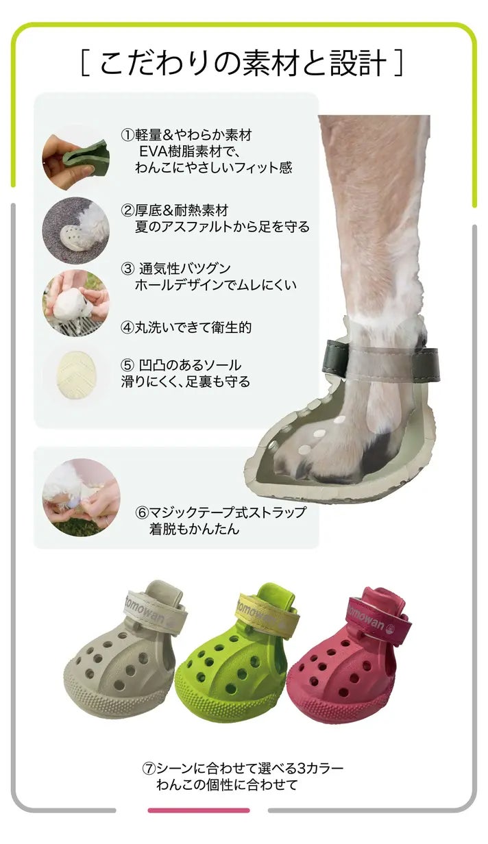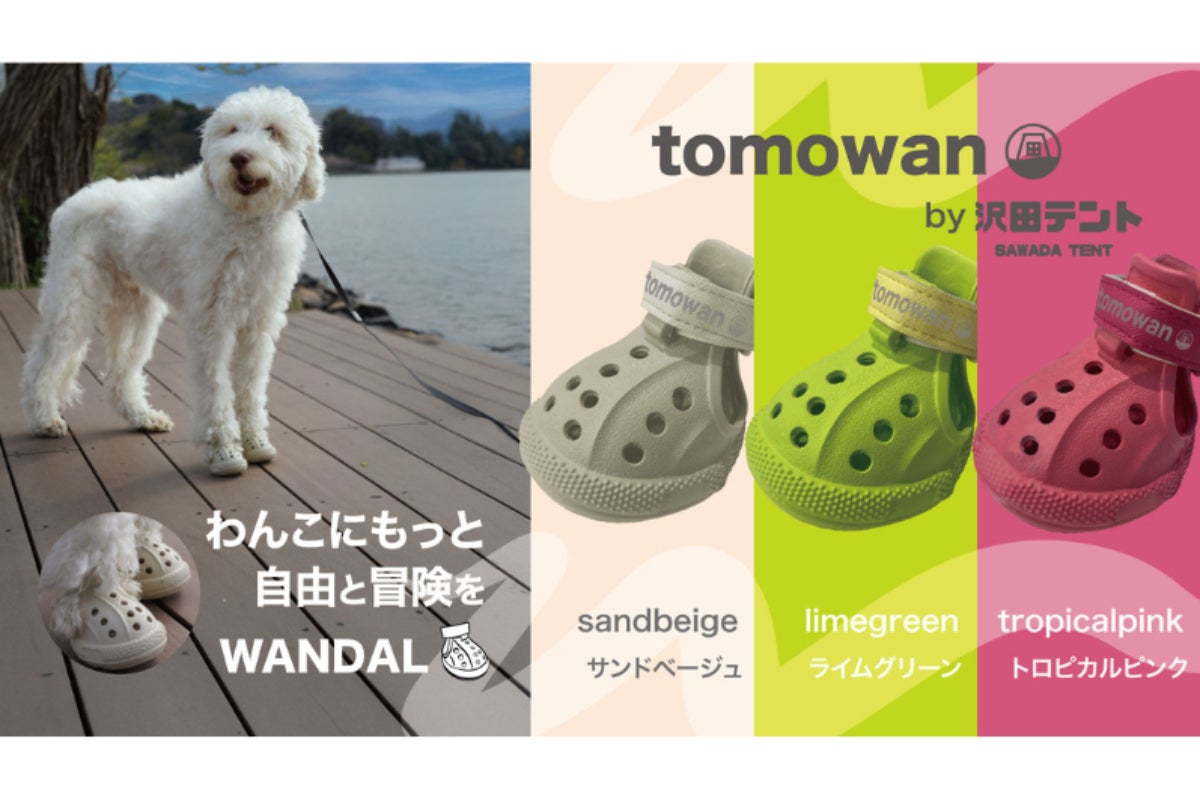 「WANDAL」は、ポップなカラーバリエーションのコットンテントが個性的なアウトドアブランド沢田テントから新たに登場したわんちゃんブランド「tomowan」の犬用アウトドアシューズです。
