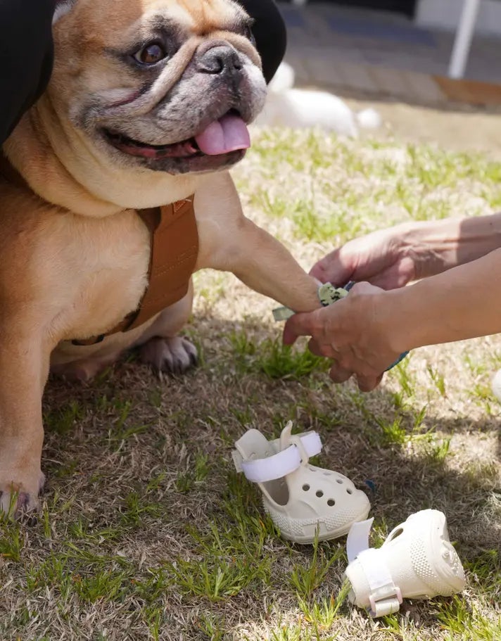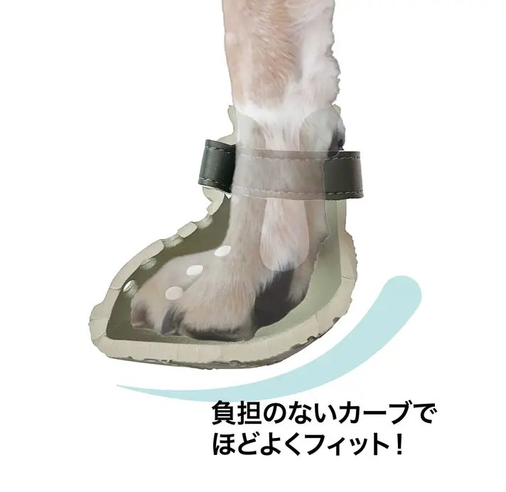 A. 調整可能なストラップでしっかりフィットするよう設計していますが、ワンちゃんの足の形によっては脱げやすい場合もございます。フィット感を見ながら、しっかりベルトでとめてあげてください。