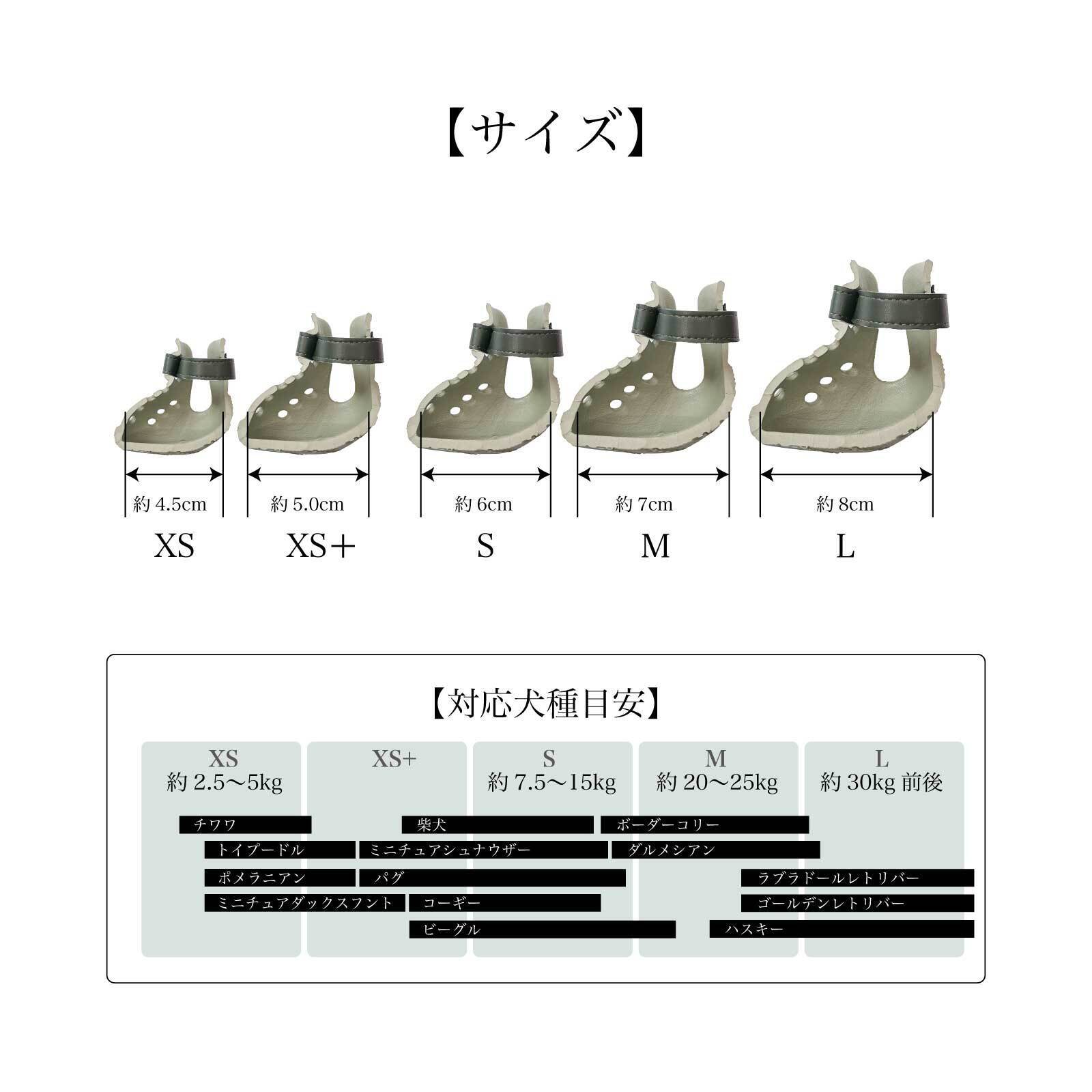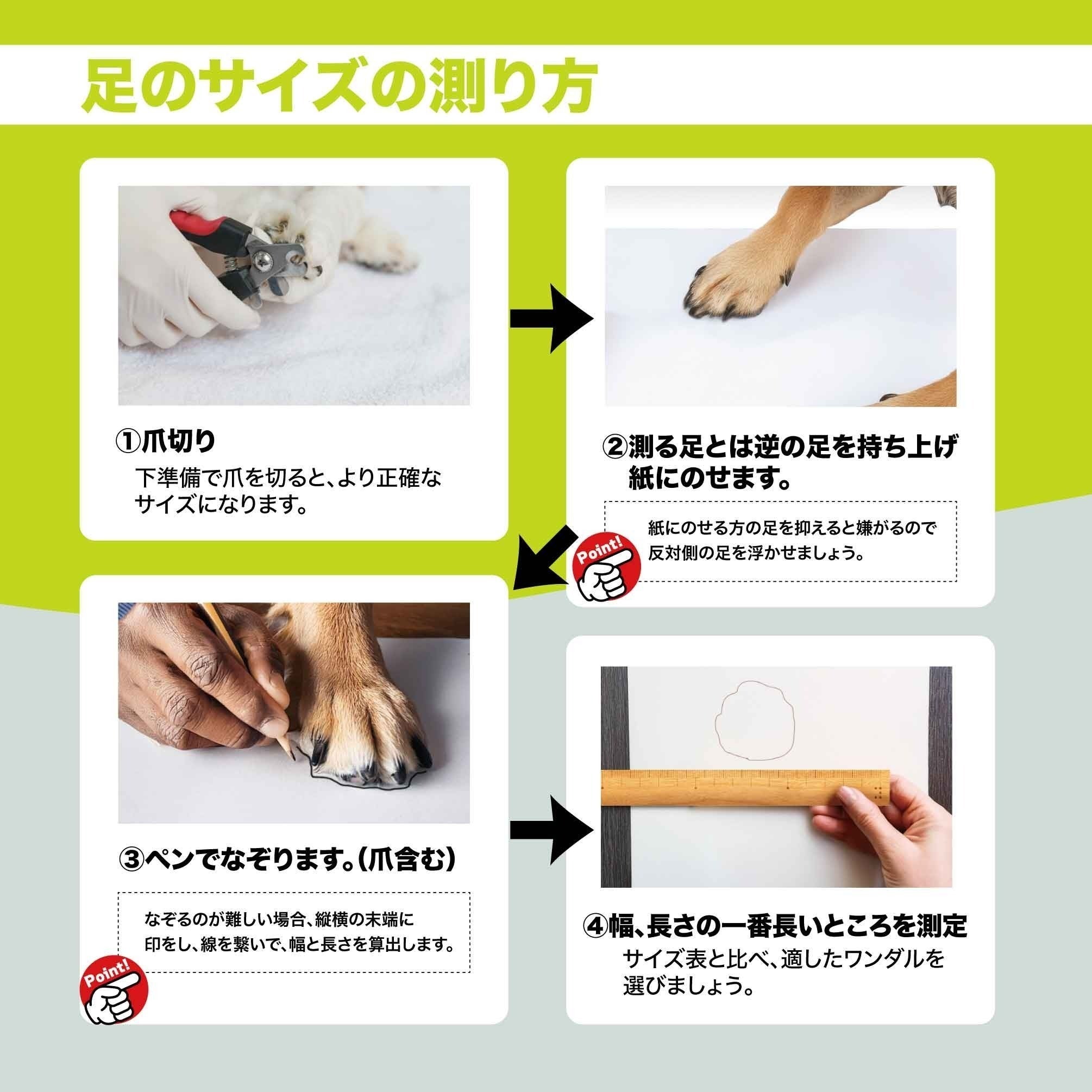 ※わんちゃんは後ろと前で足の大きさが違います。ワンダルは1足(4つ)が同じサイズですので、大きい足に合わせてサイズをお選びください。