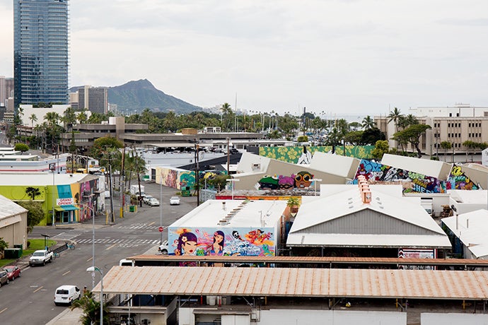 オアフ島カカアコ地区の街並み。World Wide Wallsが手がけたミューラルが所狭しと並んでいます。