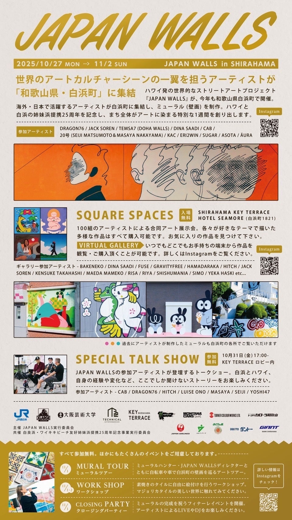 今年の参加アーティストや、過去に白浜で作品を描いたアーティストが登壇するトークショーを開催。JAPAN WALLSを通じた国際的なつながり、そしてアーティストとしての経験や変化について語ります。ここでしか聞けないストーリーをお楽しみください