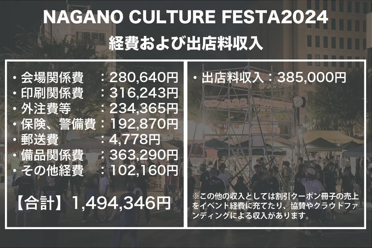 イベントについて無知だった私たちは、とにかく何も分からないところからスタートし、ゼロから作り上げる大変さを身に沁みて感じています。賛否があるかもしれませんが、後に続く若い世代へ向けて、ここで昨年の経費をオープンにしたいと思います。