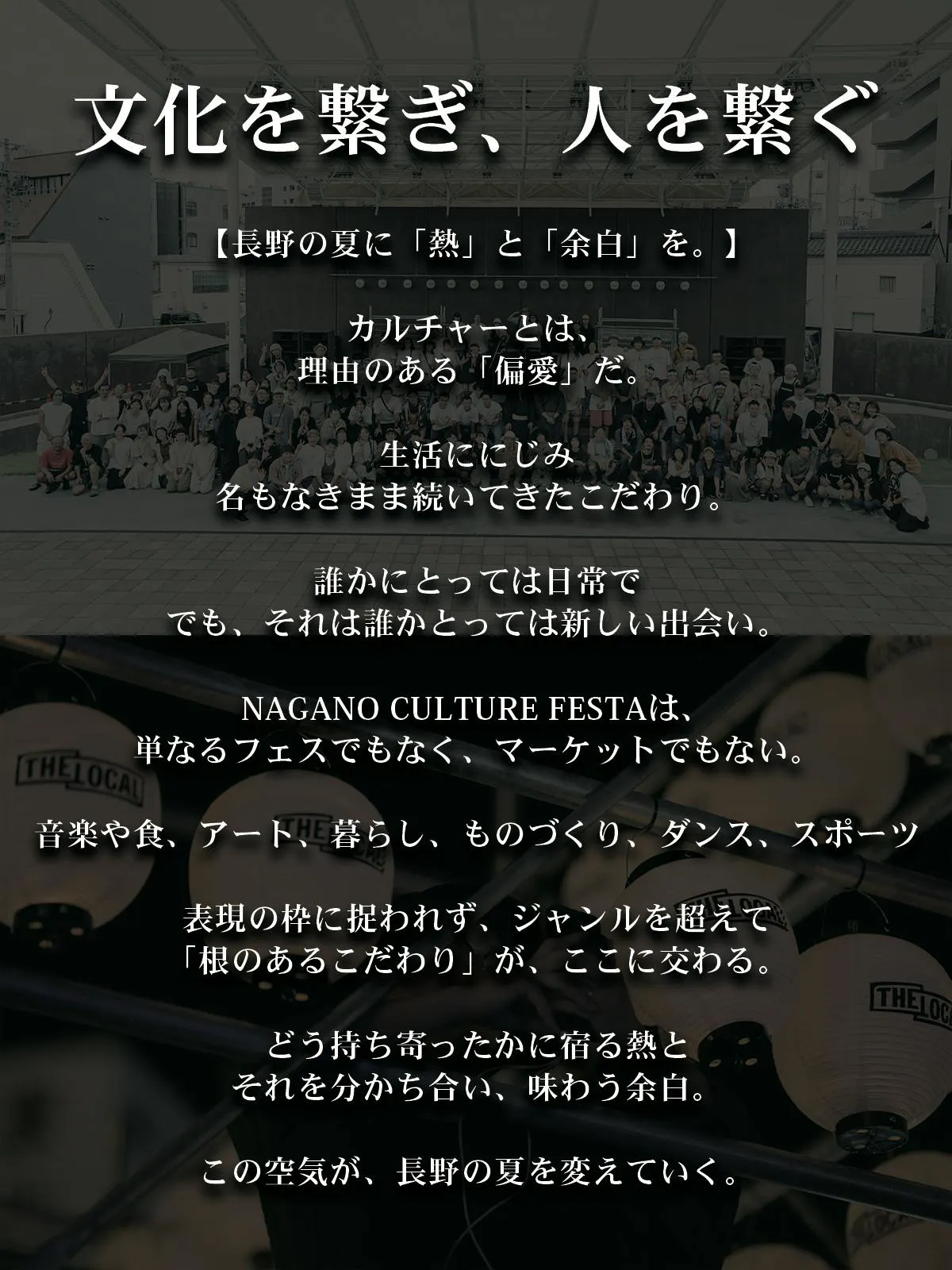 NAGANO CULTURE FESTAは、表現者と地域を、文化と人を、想いと場所を繋ぐ場です。