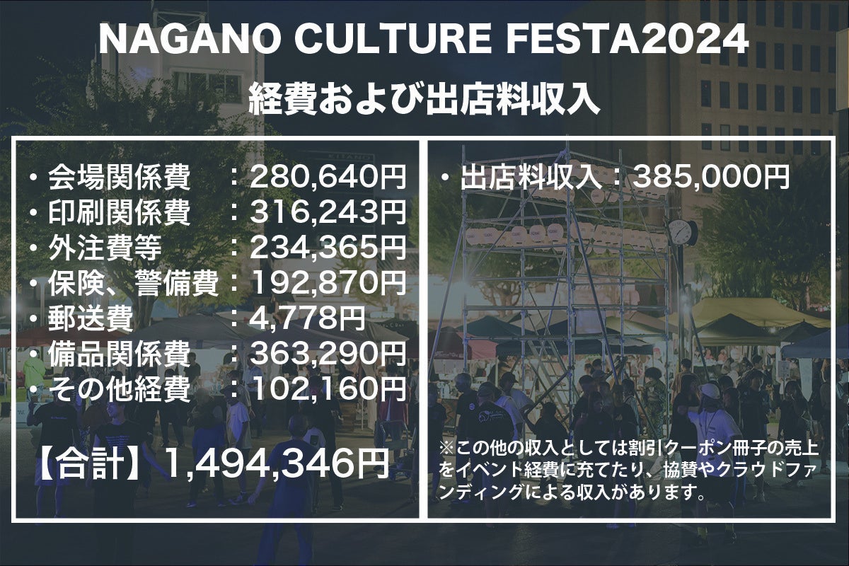 イベントについて無知だった私たちは、とにかく何も分からないところからスタートし、ゼロから作り上げる大変さを身に沁みて感じています。賛否があるかもしれませんが、後に続く若い世代へ向けて、ここで昨年の経費をオープンにしたいと思います。
