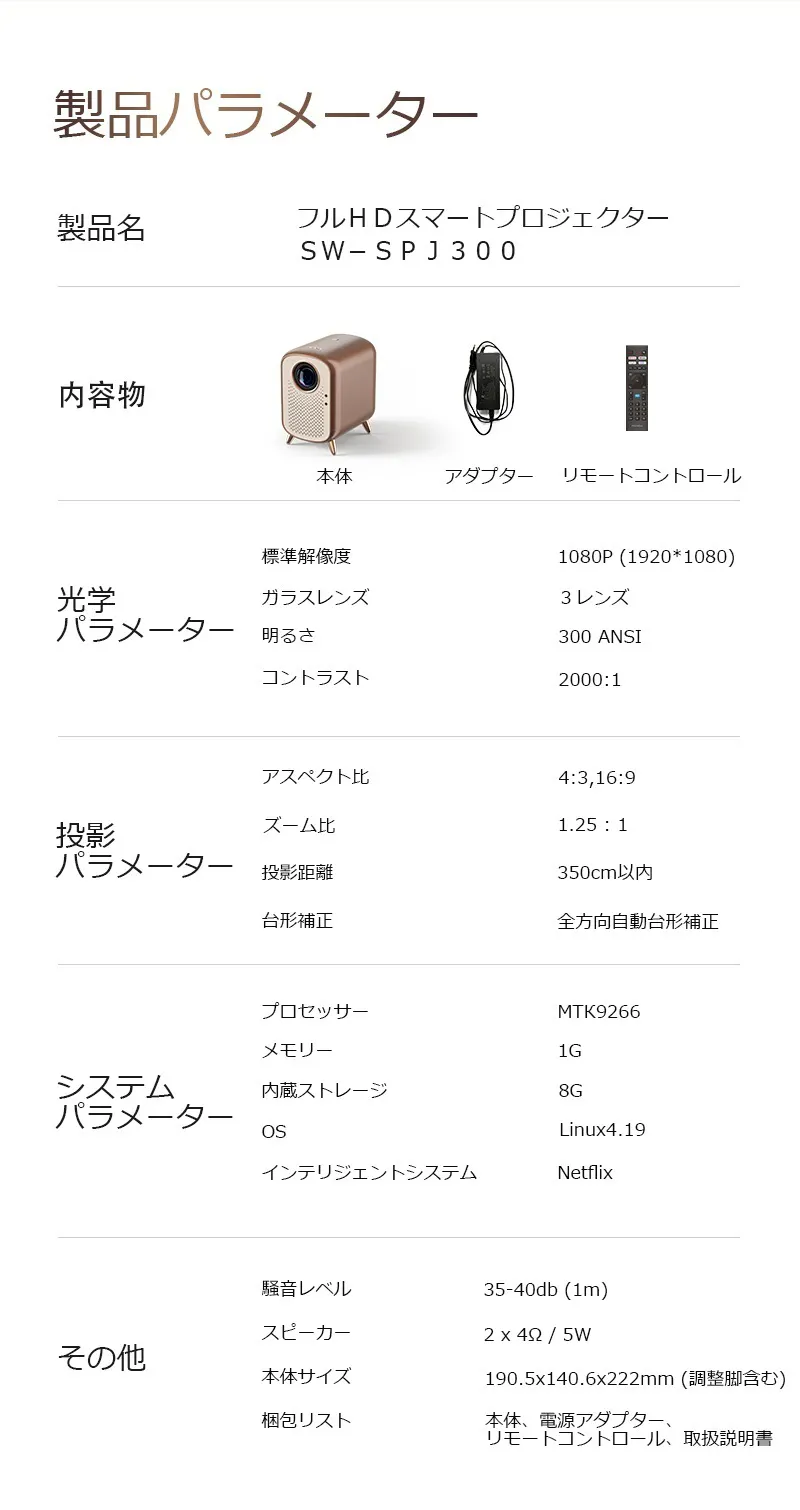 フルHDスマートプロジェクター仕様