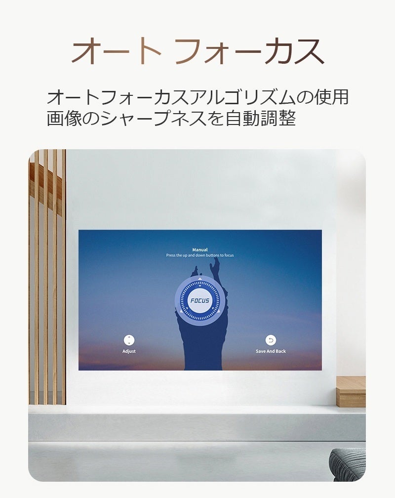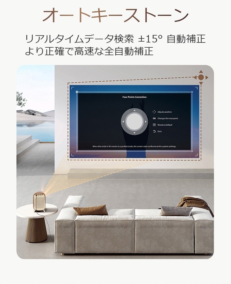 斜めに投影しても四角く表示するキーストーン(台形補正)機能を搭載するので、設置場所の自由度が広がります。オートフォーカス機能にも対応し、鮮明な映像が楽しめます。