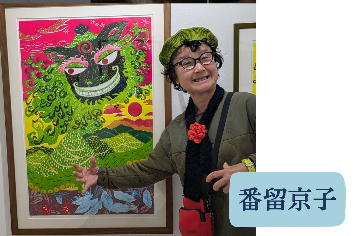 【番留京子(ばんどめ きょうこ)】富山県出身、現在は和歌山県在住の版画家。高校時代に出会ったロートレックの版画に感銘を受け、版画家を志す。タイやインドネシア、中国、メキシコなど世界各地を巡りながら創作活動を重ね、1992年に和歌山県新宮市熊野川町へ移住。以来、熊野の豊かな自然や神話、動物たちをモチーフに、木版画や木彫作品を制作している。