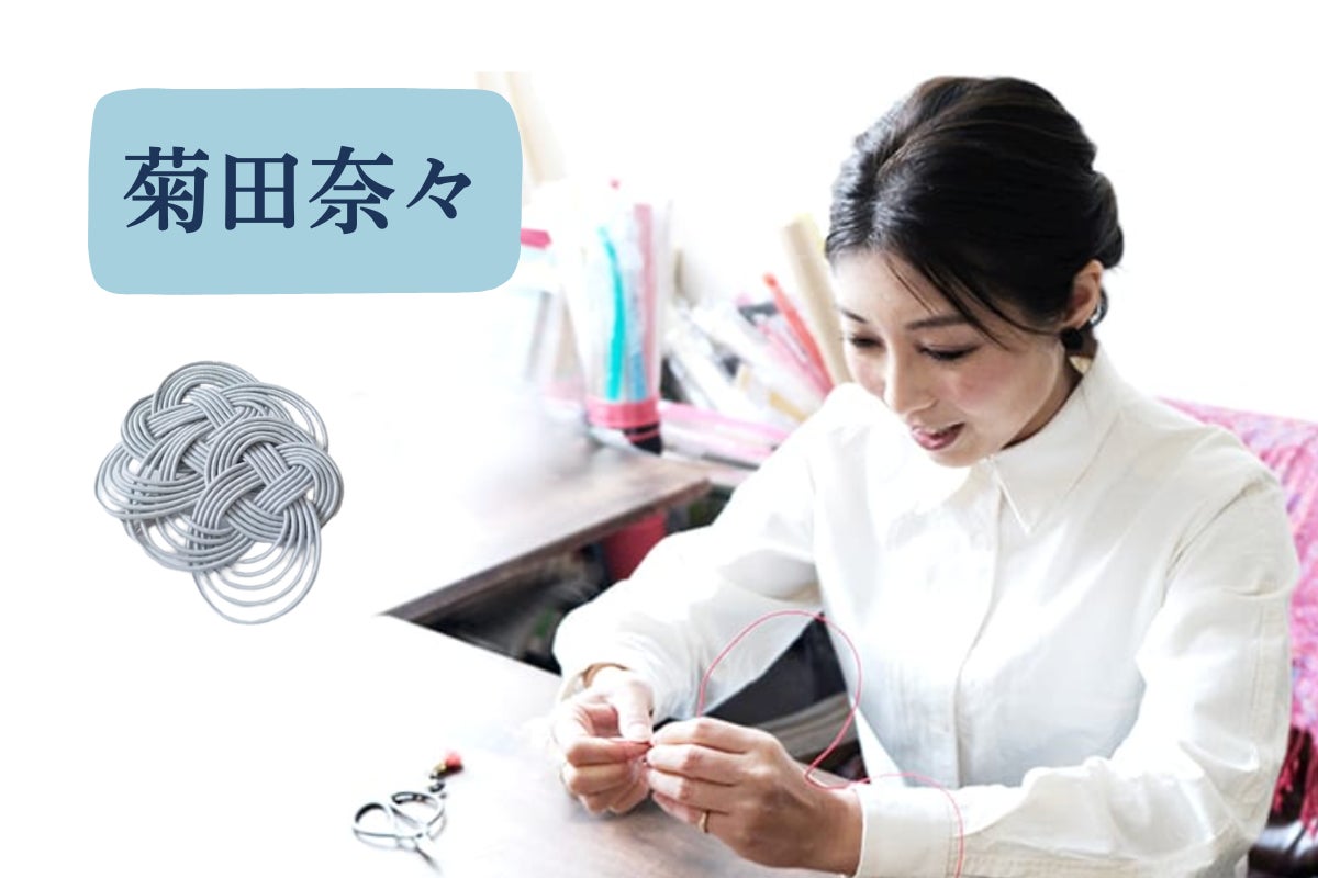 【菊田奈々(きくた なな)】水引作家・結び屋虹園主宰。グラフィックデザイナーとして活動する中、偶然100円ショップで出会った和紙の折り紙をきっかけに水引の世界に魅了され、2017年より本格的に水引作家としての活動を開始。伝統的な水引の結びや意味を大切にしながらも、自由な発想と現代的な感性を取り入れ、暮らしに寄り添う新たな水引アートを提案しています。
