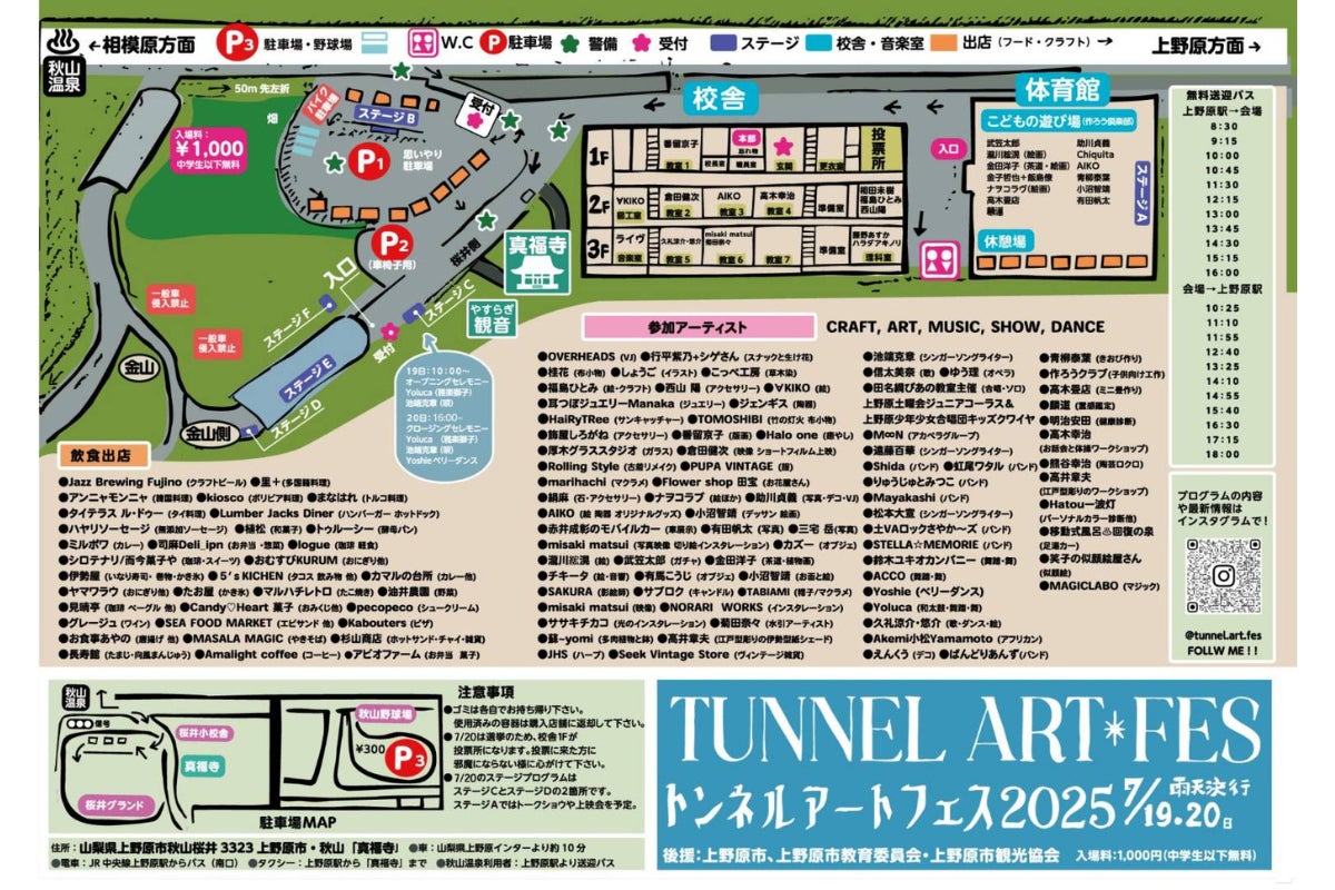 ご紹介したアーティストはごく一部。トンネルアートフェス2025には、まだまだ多くの出演者・出展者が参加します。山梨県上野原市のトンネルを完全封鎖し、2日間限定で美術館とアートフェスティバルが出現。トンネルと廃校をメインに4会場、音楽は5ステージに及び、総勢140組を超えるラインナップが、壮大な非日常体験を創り出します。
