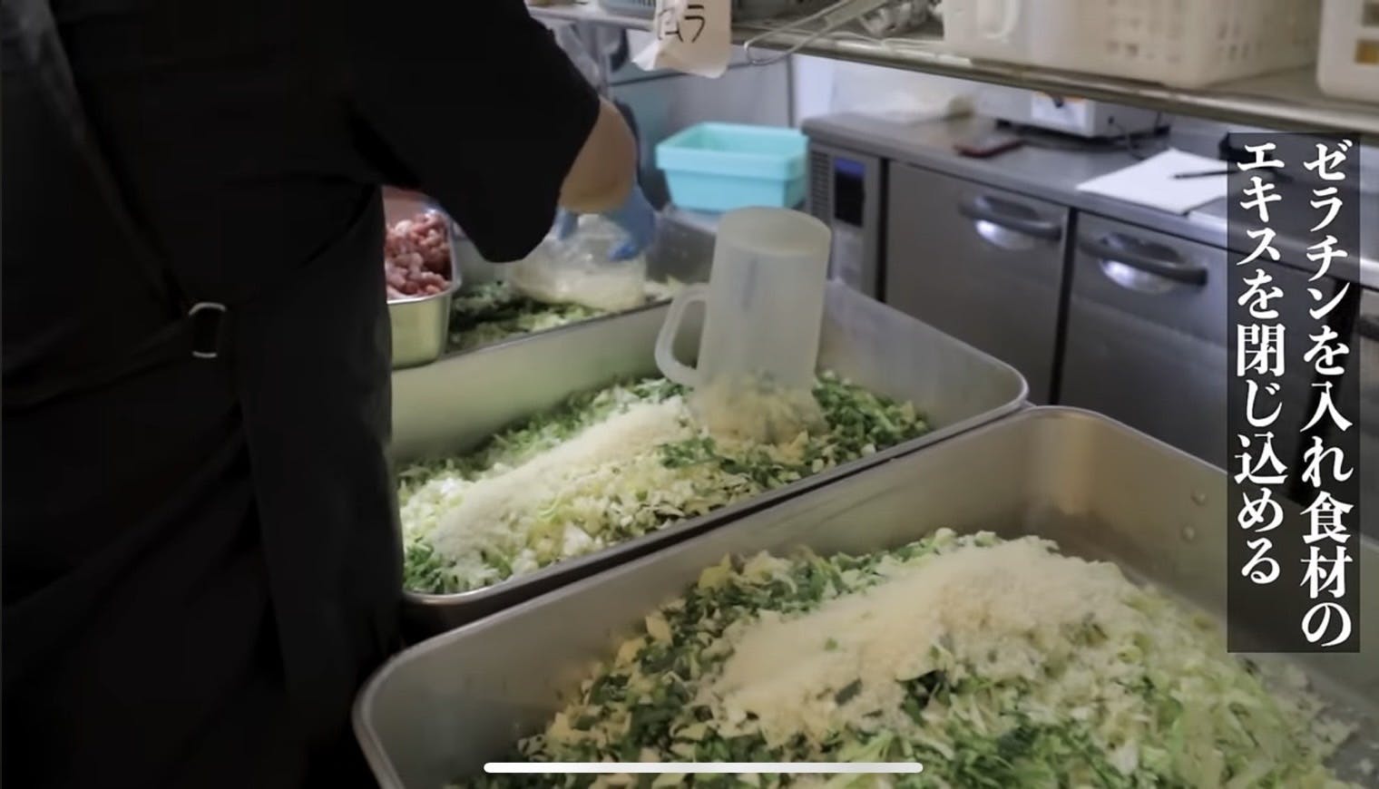 ラードを作った際に出る残った粕を捨てるのではなくミンチにして投入。これにより風味の強い餃子に。