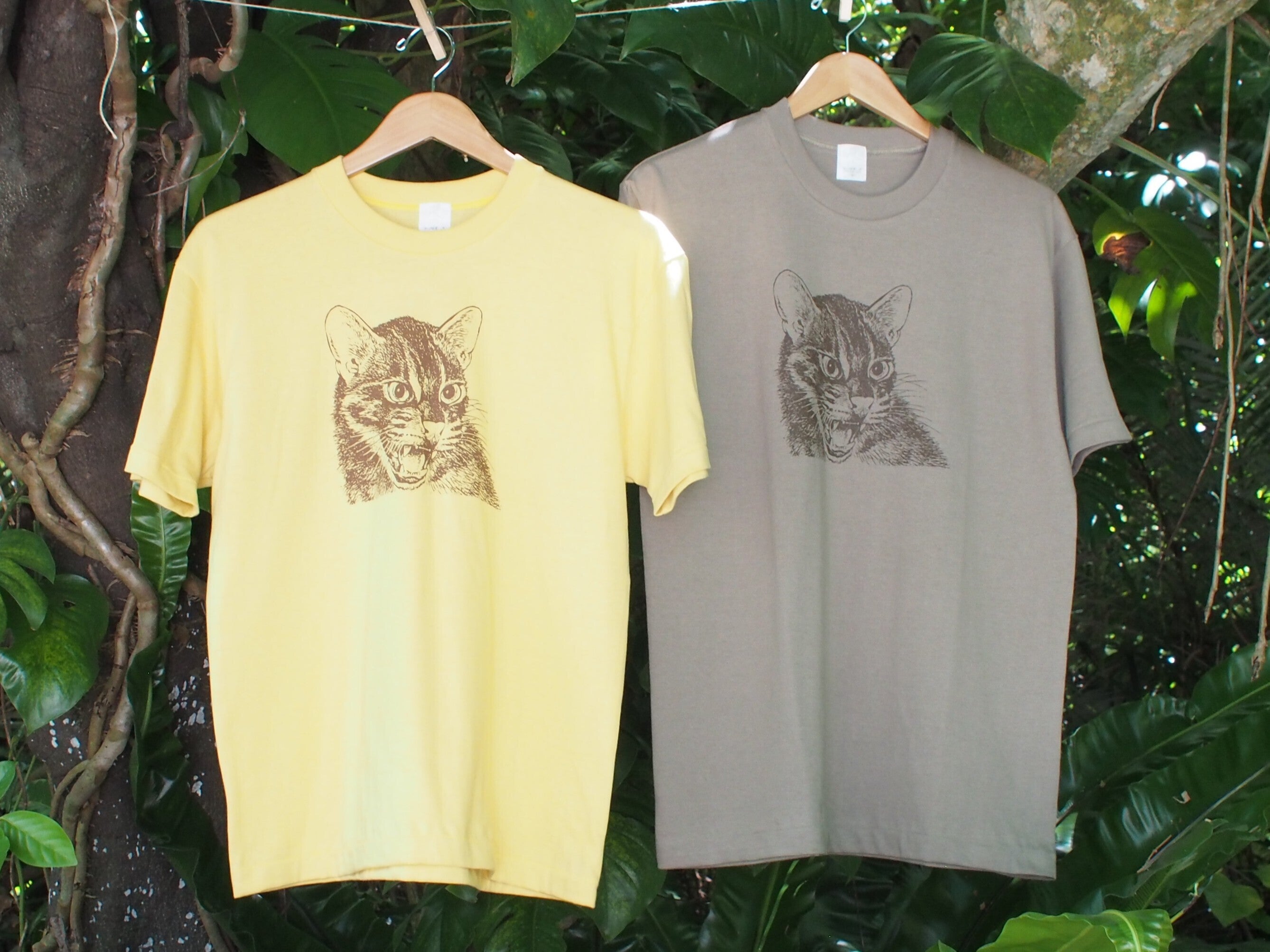それから、やまねこパトロールの活動が始まるまで、JTEF(認定NPO法人トラ・ゾウ保護基金)で大切に保管されており、過去に一度、少しだけTシャツが作成されました。線画ながら一目でイリオモテヤマネコと分かる緻密なイラストで、野生動物としての迫力が感じられる素晴らしい作品です。私はこのイラストが好きで、もう一度Tシャツを作成できないかと野生動物サポートグッズ結さんに何度もお願いをしていたのですが、イリオモテヤマネコ発見60周年の今年、ついに念願が叶い、国産Tシャツメーカーの久米繊維産のボディを使用したアップグレード版で販売されることになりました。 しかも、ありがたいことに製作費を除いた全額をやまねこパトロールにご寄付いただけることにもなりました。