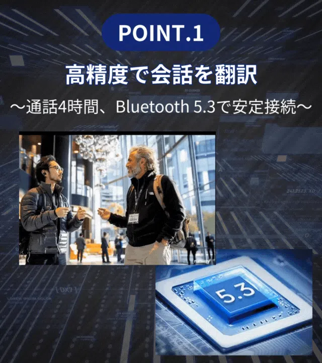 スマホの翻訳アプリを使うと手がふさがるだけではなく、文字入力や音声認識に時間がかかり、充電切の心配も、、外国人とスムーズなコミュニケーションをとるために!商談相手向けにプレゼンする時や、カウンター越しに相手と会話をしながらもてなすお寿司屋さんや鉄板焼きでも、VOROMOR V13なら両手が使えます。外国人相手に手が止まることもありません。イヤホン型翻訳機のVORMOR V13は、自分や相手の声を認識して翻訳するため手入力の必要が無く、しかも翻訳速度は最短でわずか0.3秒!長い文章でも、瞬時に音声と文字で翻訳できます。