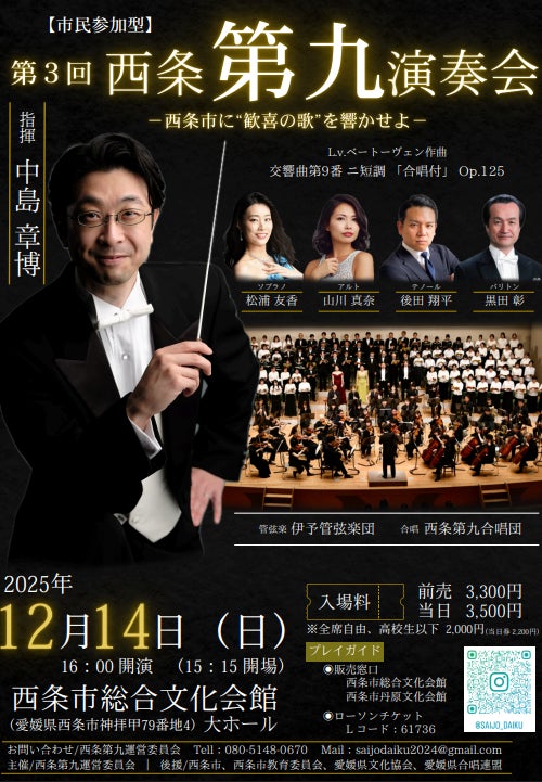 2025/12/21 16:3512月14日、前日からの雨も上がり、師走らしい寒さの中、第三回第九演奏会が無事にそして盛会のうちに終演いたしました。ご支援をいただいた皆様、ご来場いただきました皆様に心より感謝を申し上げます。当日は600人超のお客様に足を運んで頂けました。さて!!!!!実は来年の演奏会の日程がすでに決定しております!2026年12月13日(日)14時開演です。 来年もまた、西条で会いましょう! もっと見る
