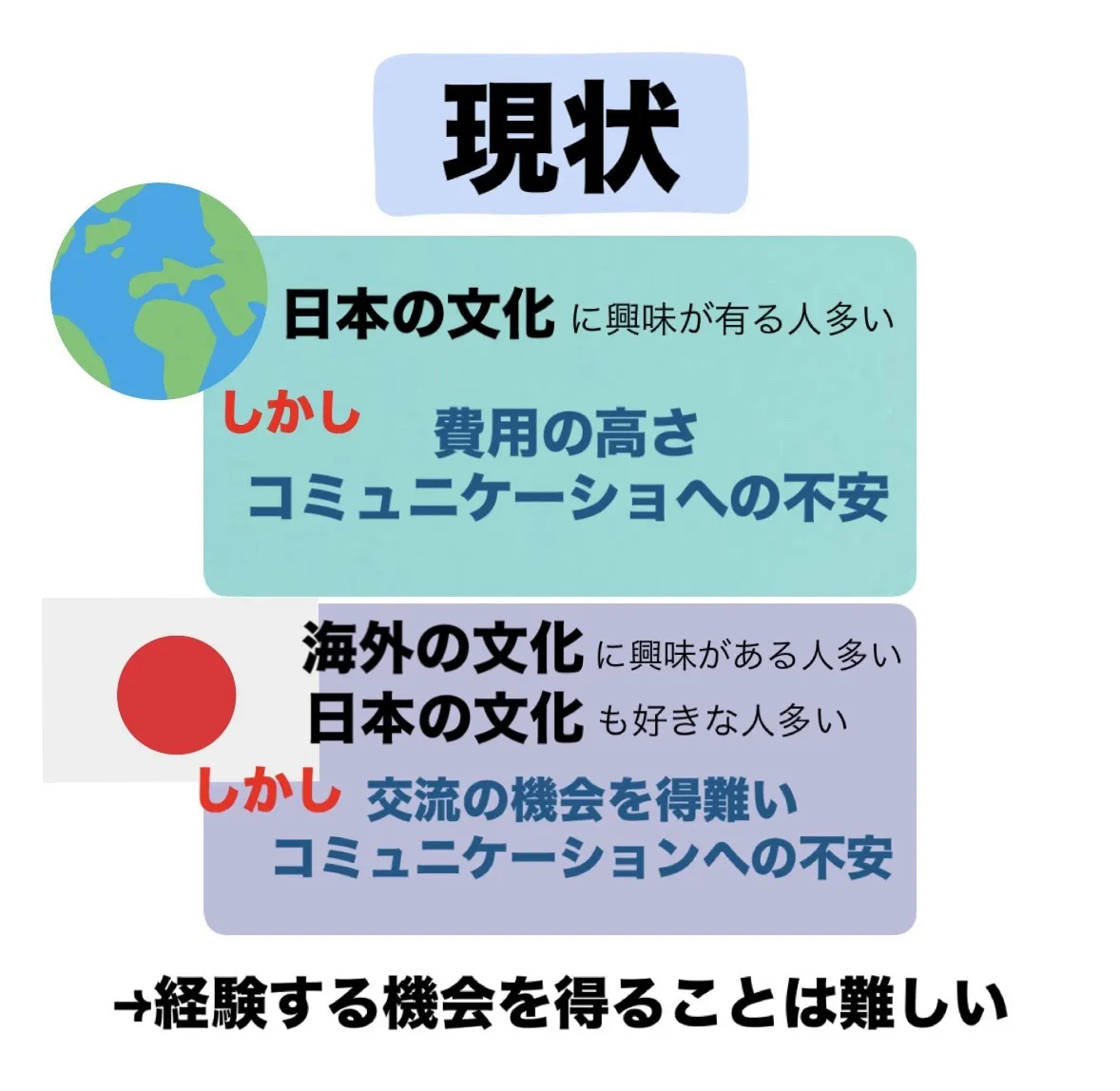 近年、日本には多くの留学生が訪れており、彼らは日本の文化について興味を持っています。しかし、参加費用が高い点や、初心者には難易度が高い点、コミュニケーションへの不安といった点から、彼らが日本の文化を深く理解する機会は限られています。