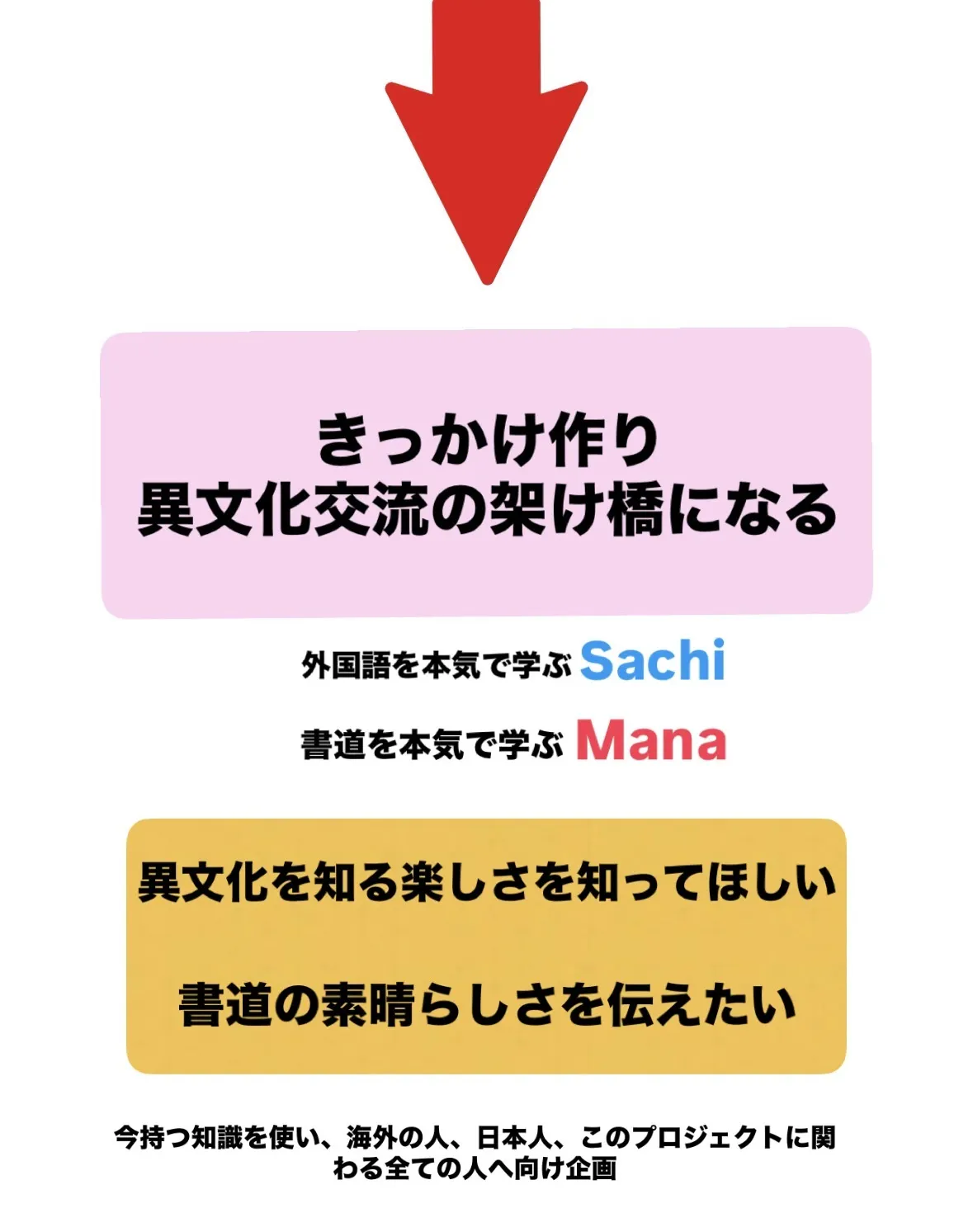 この現状を打破するべく、長年書道を本気で学び、普段から書道の魅力を伝えるManaと、海外の人へ日本の素晴らしい文化を体験してほしい、そして日本人にも異文化を持つ人々と交流し新たな世界を知る楽しさを知ってほしいと強く思うSachiが、双方の架け橋となり、国際交流、異文化理解を促進させたいと考えています。