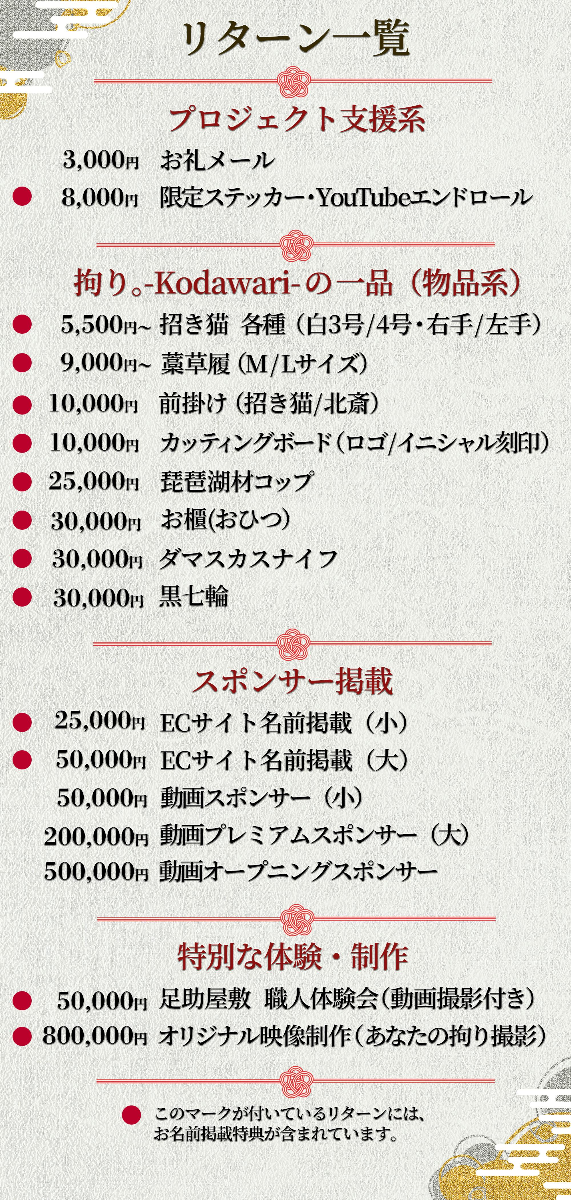 今回のクラウドファンディングでは、複数のリターンをご用意しておりますが、「お名前掲載特典」が含まれているものは、リターン一覧画像の左側に「赤い丸」がついています。