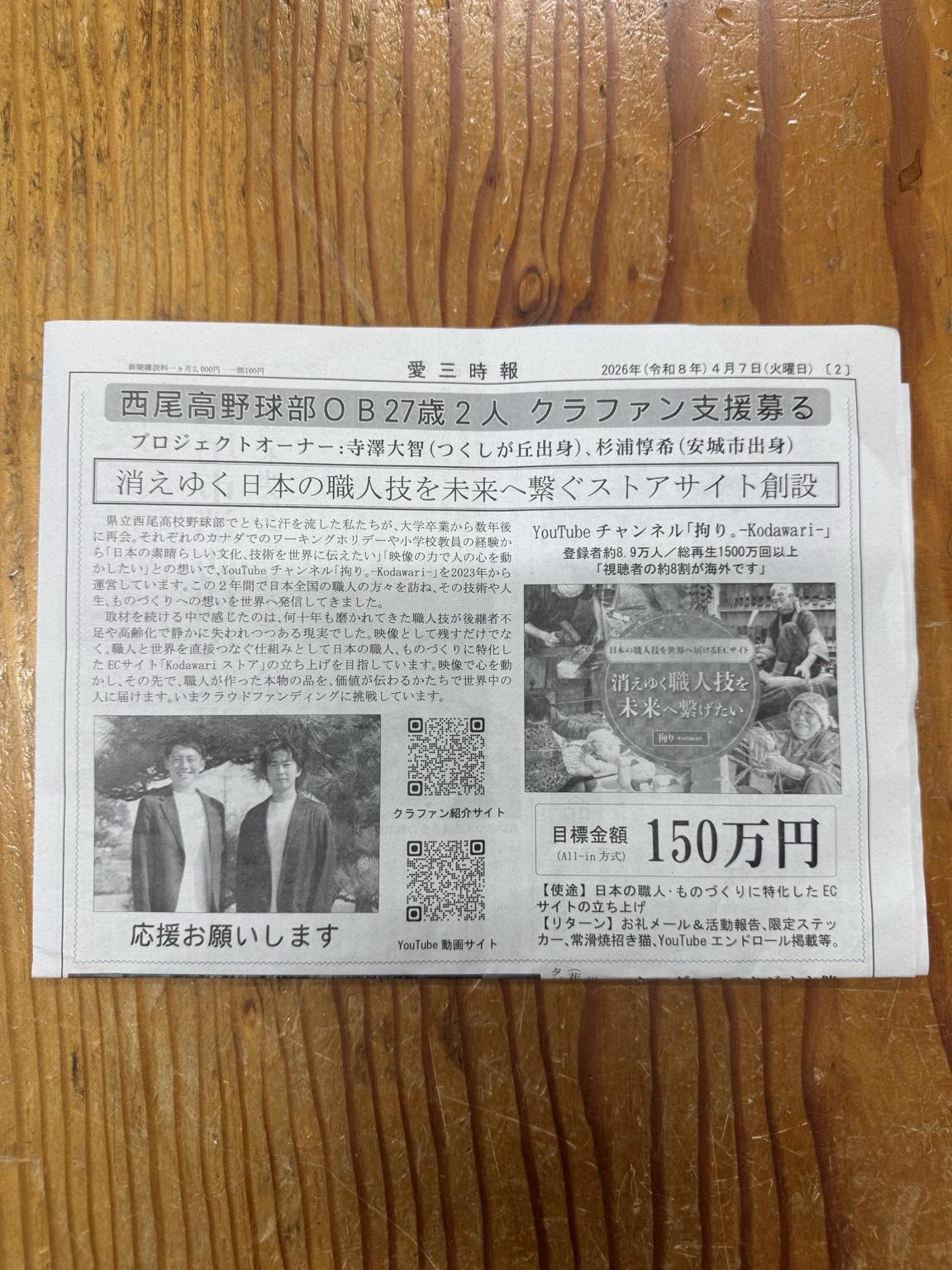 2026/04/09 20:00この度、地域に根ざした新聞「愛三時報」様に、私たちのクラウドファンディングを取材していただきました。愛三時報は、西三河エリアの企業や人、ものづくりの現場を丁寧に取り上げ続けている、地域密着型の新聞です。大きなメディアでは決して拾いきれない、“現場のリアル”や“人の想い”を届け続けている存在です。そんな愛産時報に、今回の挑戦を取り上げていただけたことを、心から嬉しく思います。私たち「拘り。-Kodawari-」は、日本のものづくりの現場に足を運び、その技術と想いを、世界へ届ける活動をしています。しかし今、その“本物の技術”が、静かに消えかけています。・後継者がいない・販路がない・知られていないこのままでは、確実に無くなってしまう。だからこそ私たちは、動画と越境ECを通して、「世界に届ける仕組み」を作ろうとしています。これは単なるクラウドファンディングではありません。日本のものづくりの未来を守り、次の世代へ繋げるための挑戦です。愛三時報様のように、地域の現場を信じて発信し続けている存在があるからこそ私たちの活動にも意味が生まれます。今回の掲載をきっかけに、少しでも多くの方にこの挑戦を知っていただけたら嬉しいです。クラウドファンディングは残り10日。もし少しでも共感していただけた方は、ぜひ応援・拡散のご協力をお願いいたします。最後の最後まで走り続けます!この技術を、このまま終わらせないために。拘り。-Kodawari-寺澤大智/杉浦惇希 もっと見る